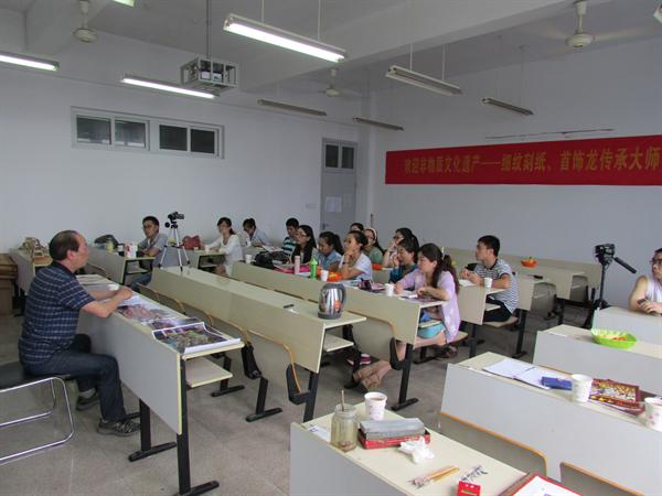 2014年5月26日下午,浙江省非物质文化遗产项目“首饰龙制作工艺”传承人林顺奎先生在人文楼410教室为德赢官网民俗学研究生做了一场题为“妙手生花——省级非遗项目首饰龙制作工艺”的讲座。同来的还有他的徒弟黄孟先生(也是其女婿)。他们还带来了首饰龙制作流程模型、细纹刻纸部分作品、相关书刊、图片等实物资料,并布置在教室里。讲座由2012级研究生郭重孟同学负责操办并主持。德赢官网民俗学学科负责人黄涛教授和育英图书馆民俗特藏室万军主任出席。