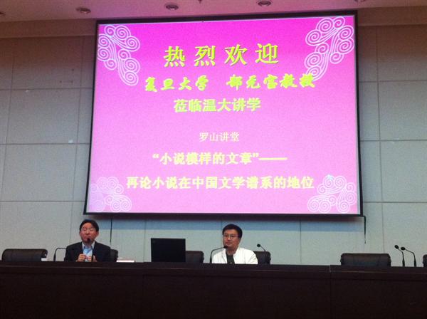 11月11日晚,2013年第24期罗山讲堂在德赢ac米兰官方合作vwin育英图书馆拉开盛幕,本次讲堂的主题为“小说模样的文章——论小说在中国文学谱系中的地位”。主讲为来自复旦大学的郜元宝教授。出席人员有学院党总支书记吴静、副院长孙良好、青年作家马小予、崔勇和陈小碧博士。