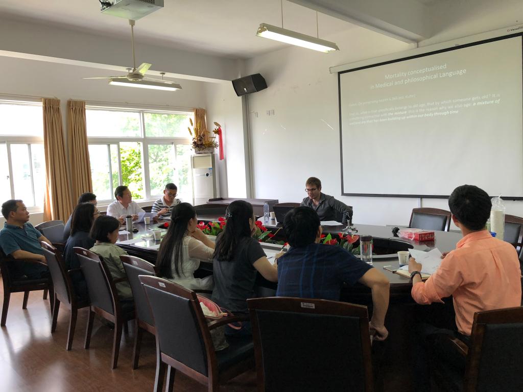郑春生副院长首先介绍了人文学术沙龙的背景,并强调了学术沙龙对于学院学科融合,提升学院学术氛围的重要性。在接下来的沙龙中,Luca博士从古希腊文本出发,从语义学和概念史角度解读了古希腊文明中的死亡观点。Luca博士认为在古希腊人的观念中,死亡观念是建立在人与神差异的基础上形成的,死亡是人的属性,但这并不意味人不可以转变为神;每个人出生时都具备人性和神性,死亡则可以视为是人身上的人性消失,保留神性的过程;如果人在死亡之后要保留神性,则需要经历一个神圣化的仪式,因此并不是每个人死亡之后都可以成为神。在沙龙最后,与会者与Luca博士一起,就“死亡”、“永恒”、“时间”以及“存在”等一些核心概念进行了深入的讨论。