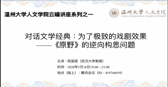 2020年5月18日晚7点,武汉大学文学院的陈国恩教授做客德赢官网云端系列讲座,讲授曹禺的经典剧作《原野》。讲座由孙良好院长、鲍良兵老师主持。