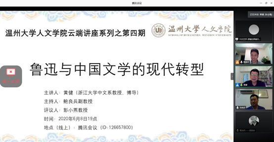 6月8日晚7点,德赢官网云端讲座第四场在腾讯会议如期举行。浙江大学中文系黄健教授作了题为“鲁迅与中国文学的现代转型”的报告,此次讲座由孙良好院长、鲍良兵老师主持。