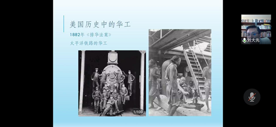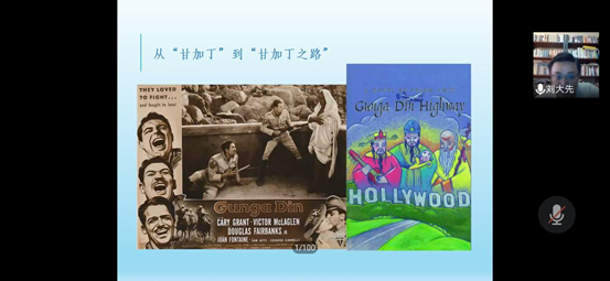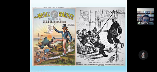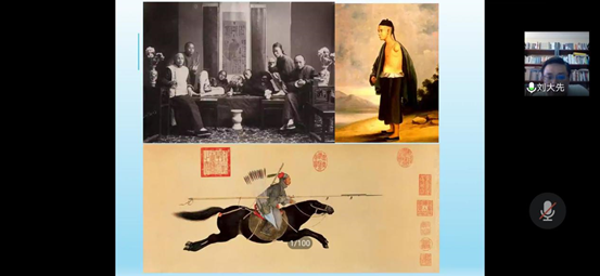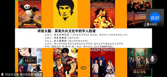 刘大先老师开场介绍了讲座主题的由来,举办一个《英美大众文化中的华人形象》的讲座缘于受到佛山与温州两座侨乡城市的启发和最近发生的作家於梨华逝世事件。他从最近受到热议的漫威将拍摄的华人英雄电影《 尚气(SHANG-CHI)》引入,追溯英美电影文化中的华人形象的变迁。刘老师提到由侦探小说家萨克斯·罗莫1913年创造的,并于1929年开始拍摄系列电影的西方黄祸论的拟人化形象——邪恶博士傅满洲,还有由比格斯创造的也被搬上荧屏的陈查理的故事。紧接着,刘老师讲到了英美图像中的中国人形象绘画,讲到在19世纪之前意大利宫廷画家郎世宁画的中国骑兵英勇彪悍,而在20世纪的中国广东画家笔下却是患病的残缺的、深受鸦片毒害的中国人形象。刘大先老师感叹道这是一个非常有趣的现象:西方人对华人的印象和华人的自我刻画的形象是相互交错的。在讲座的后半程,刘大先老师用很长的篇幅重点讲述了在20世纪后期的英美大众文化中的华人脸谱,并例举了赛珍珠与《大地》、尊龙与《蝴蝶君》《末代皇帝》、甘加丁 、华人导演王颖与《雪花秘扇》这些丰富的例子。并且详细讲述了近三十年来影视文化中华人形象的变迁。由此可以归纳出三种英美人们心目中的华人形象:邪恶的敌人(傅满洲)、 可靠的公民(陈查理)、 沉默的苦人(甘加丁)。其中让听众印象深刻的是刘大先老师例举了学者萨义德的著作《东方学》的扉页上的一句话“他们无法表述自己; 他们必须被别人表述”以此来说明华人在英美乃至西方都是被定义的另一方,而没有自己表述的权利。讲座尾声,刘老师在结语中提出了两点思考:其一,我们是无法站在超然的位置看待事情的,要认识到事情背后的意识形态机制,但最重要的是要做出自己清晰的判断;其二,学术研究不应当是不食人间烟火的,而要有现实关怀。