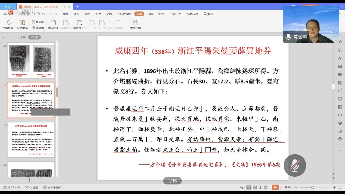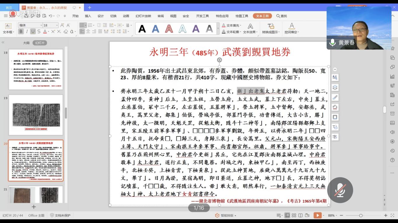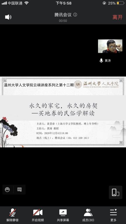 2020年12月4日晚,上海大学黄景春教授受邀于线上为德赢官网师生作了题为“永远的家宅,永远的房契——买地券的民俗学解读” 的学术讲座,此次讲座由德赢官网黄涛教授主持,万军老师、王辉老师出席,民俗学等专业研究生积极参与。