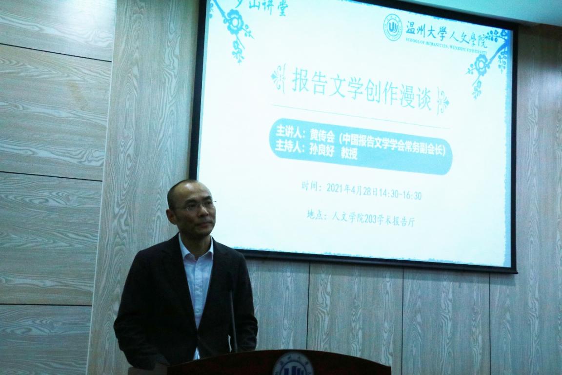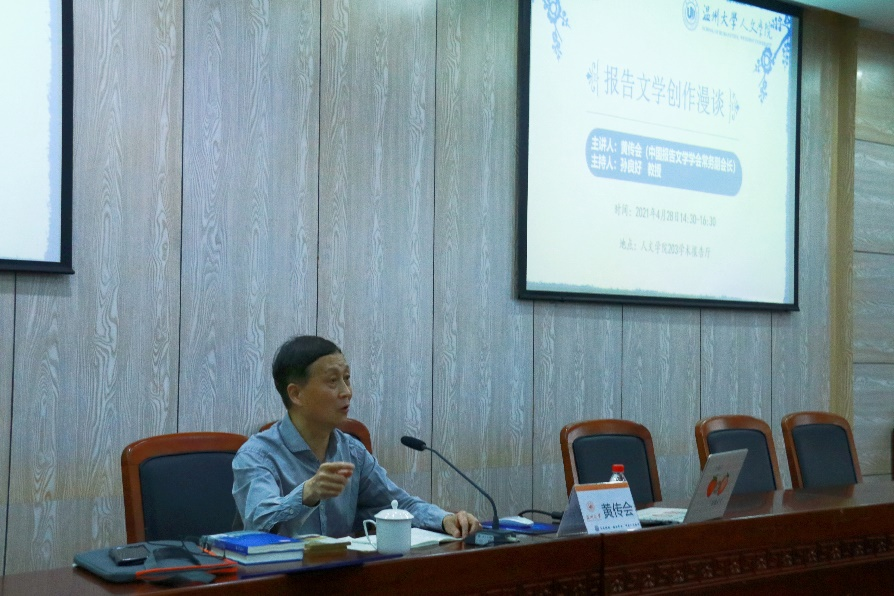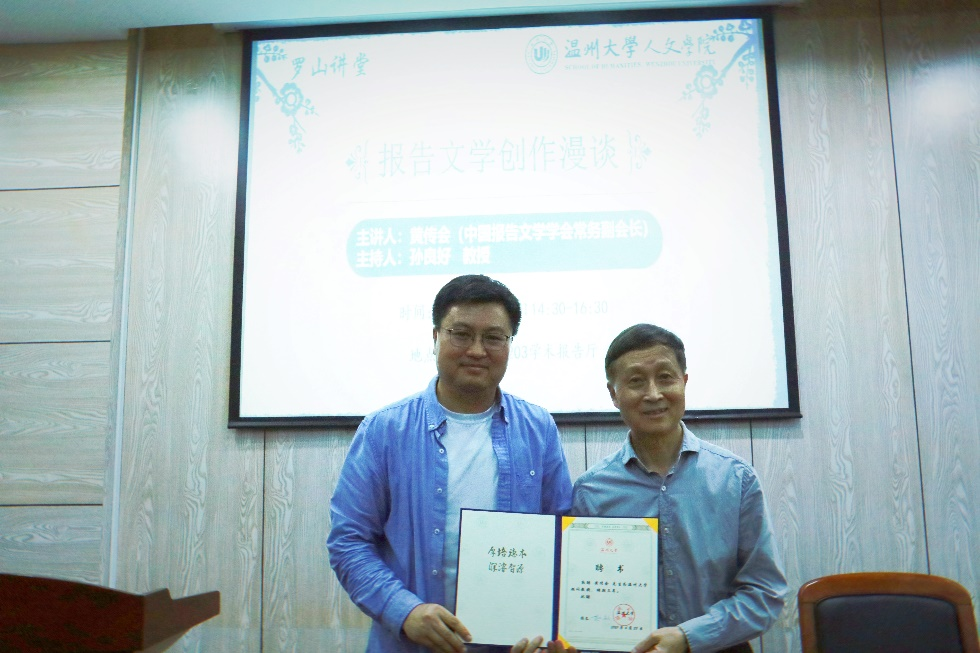 2021年4月28日下午,中国报告文学学会常务副会长黄传会先生应邀到德赢官网作《报告文学创作漫谈》的学术讲座。讲座由德赢官网孙良好院长主持,我校对报告文学创作感兴趣的师生到场聆听讲座。讲座现场,黄传会先生应邀成为我院教授顾问,由孙良好院长为其颁证。