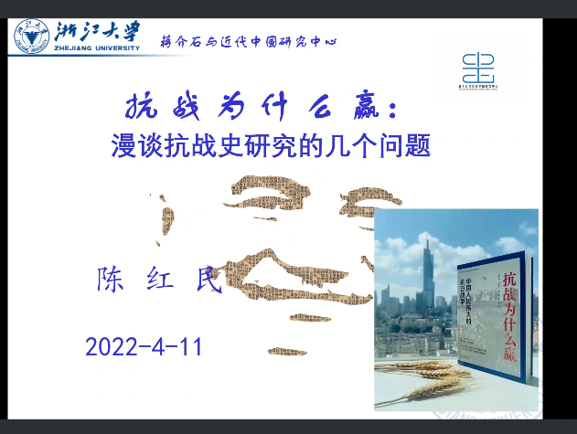 2022年6月2日18:30,浙江大学求是特聘教授、国家社科基金评委、浙江大学蒋介石与近代中国研究中心教授兼主任,博士生导师陈红民应邀为德赢官网作学术讲座。本次讲座由刘建国教授主持,在线上开展。陈红民教授就自己的研究方向向我们介绍了有关抗战史的研究成果。