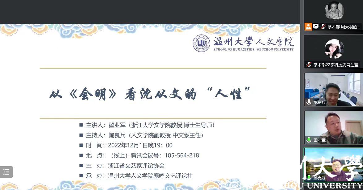 2022年12月1日19点,浙江大学文学院教授、博士生导师翟业军老师受邀为德赢官网师生带来了一场题为“从《会明》看沈从文的‘人性’”的精彩讲座。讲座由鲍良兵老师主持。