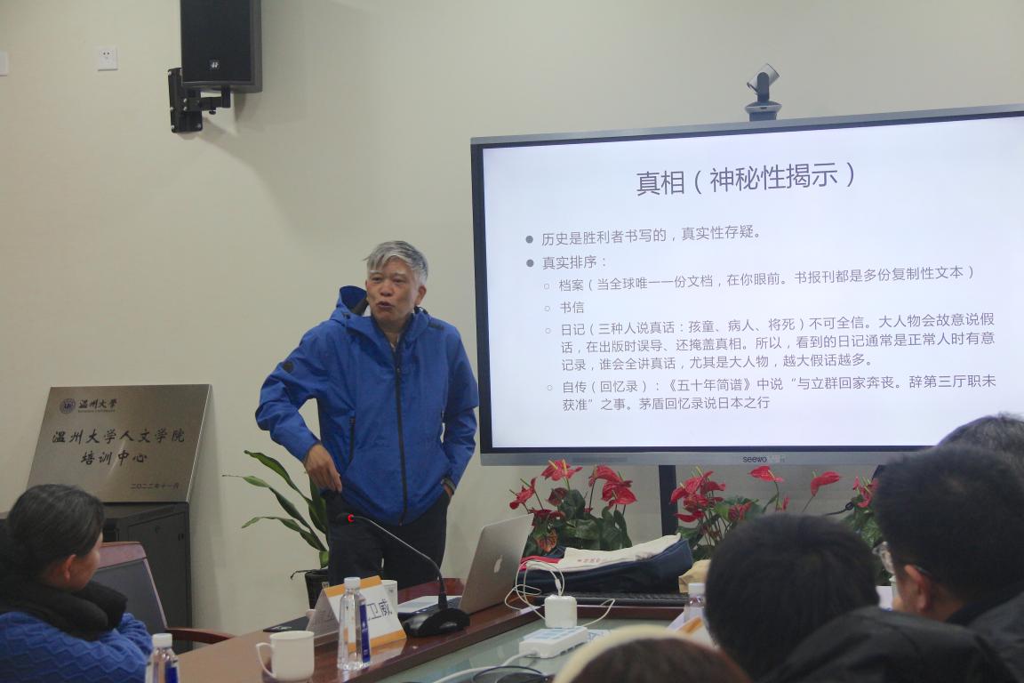 “做史料和其他研究是不一样的,我们必须确立一种对于史料的特殊的敏感或者说是感知。”沈卫威教授叮嘱在座的研究生要培养史感,训练档案意识,增强材料的关联感。沈卫威教授给史料的可信度进行了划分,从高到低依次是:第一是档案,第二是书信,第三是日记,第四是自传(回忆录)。档案研究可以还原真相(神秘性揭示),历史是胜利者书写的,真实性存疑,所以档案研究者要从“隐藏文本”档案中发现蛛丝马迹,去伪存真,显示正确的“真实”。更重要的是还要“升发出论”。