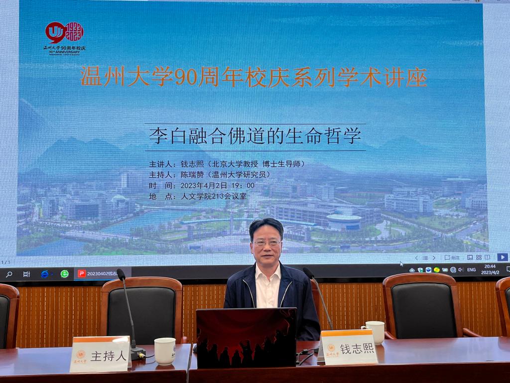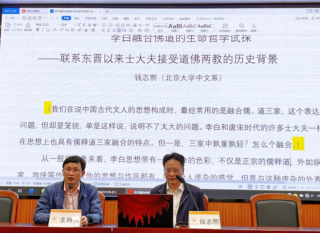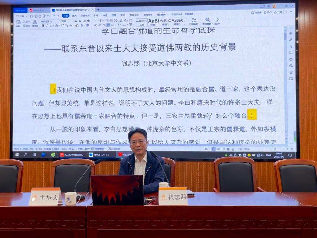 2023年4月2日晚,教育部长江学者特聘教授、北京大学中文系教授钱志熙老师应邀在德赢官网203学术报告厅举办了以“李白融合佛道的生命哲学”为题的讲座,本次讲座由陈瑞赞教授主持。