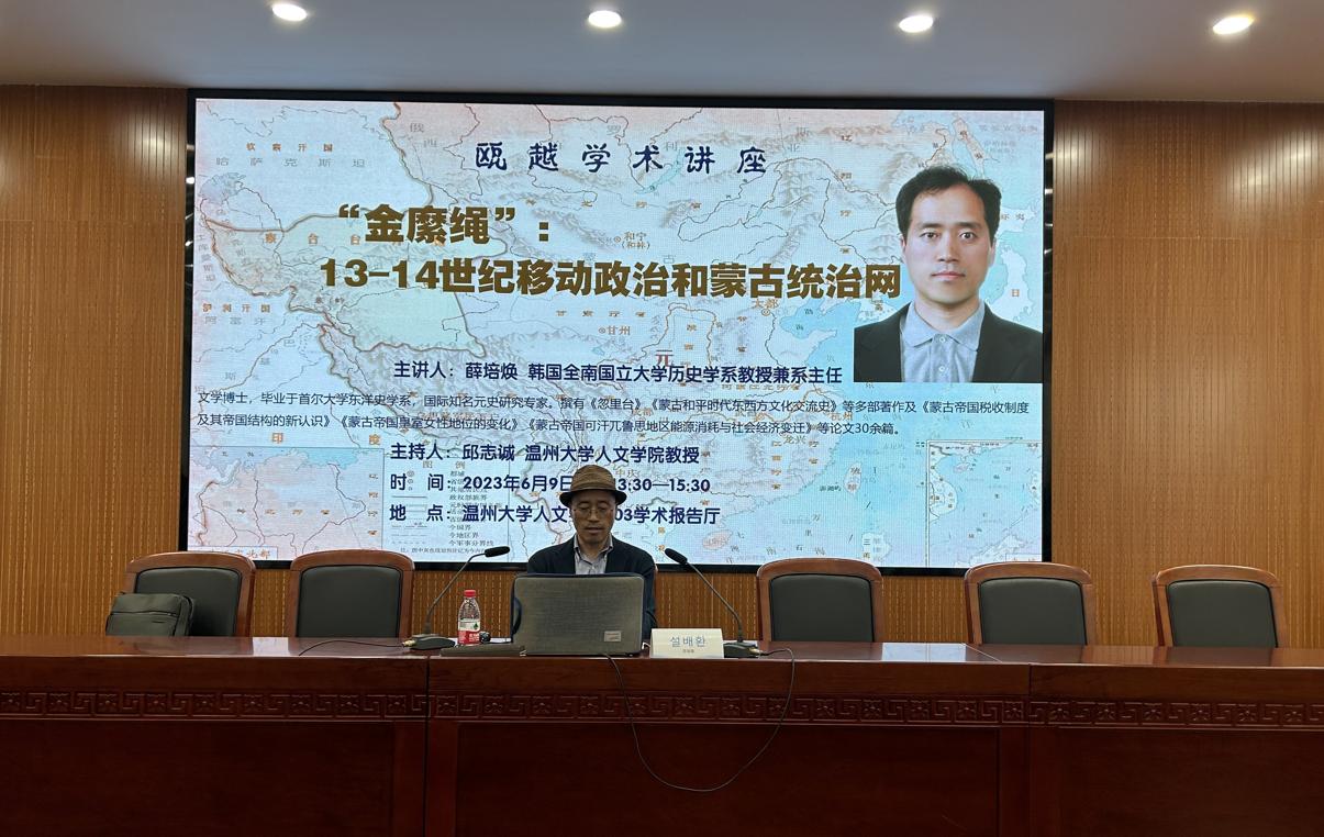 2023年6月9日下午,韩国全南国立大学历史学系教授兼系主任설배환(薛培煥)教授应邀在德赢官网学术报告厅举行了题为《“金縻绳”:13—14世纪移动政治和蒙古统治网》的学术讲座。本次讲座由邱志诚教授主持,王长命副教授及相关专业本科生、研究生60多人参加了讲座。我校教育学院郑晓丽教授、潘盈盈博士也出席了讲座活动。