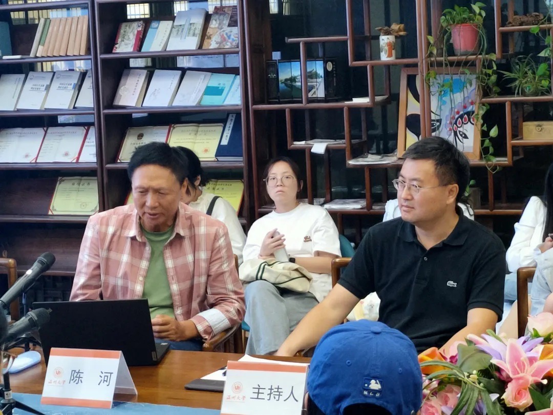 陈河老师对于故土情节、生命体验、创作心得等感性经验的讲述唤起了在座学生对文学温州书写的别样感受。孙良好老师对陈河老师的精彩演讲进行了提纲挈领的总结,认可其作品在近现代温州人文书写的重要作用。方韶毅老师就地方书写、历史写作、女性塑造等角度,与陈河老师进行了对话。鲍良兵老师则是从文学史角度出发,谈及《误入孤城》该部小说在乡绅人物塑造、地方史、商业现代性方面的文学史贡献。现场中文系研究生们也分享了自己的感悟,并从陈河小说的“互文性”角度、女性主义角度提出自己的疑问,陈河老师耐心地进行了解答。整场讲座在轻松愉悦的氛围中结束。
