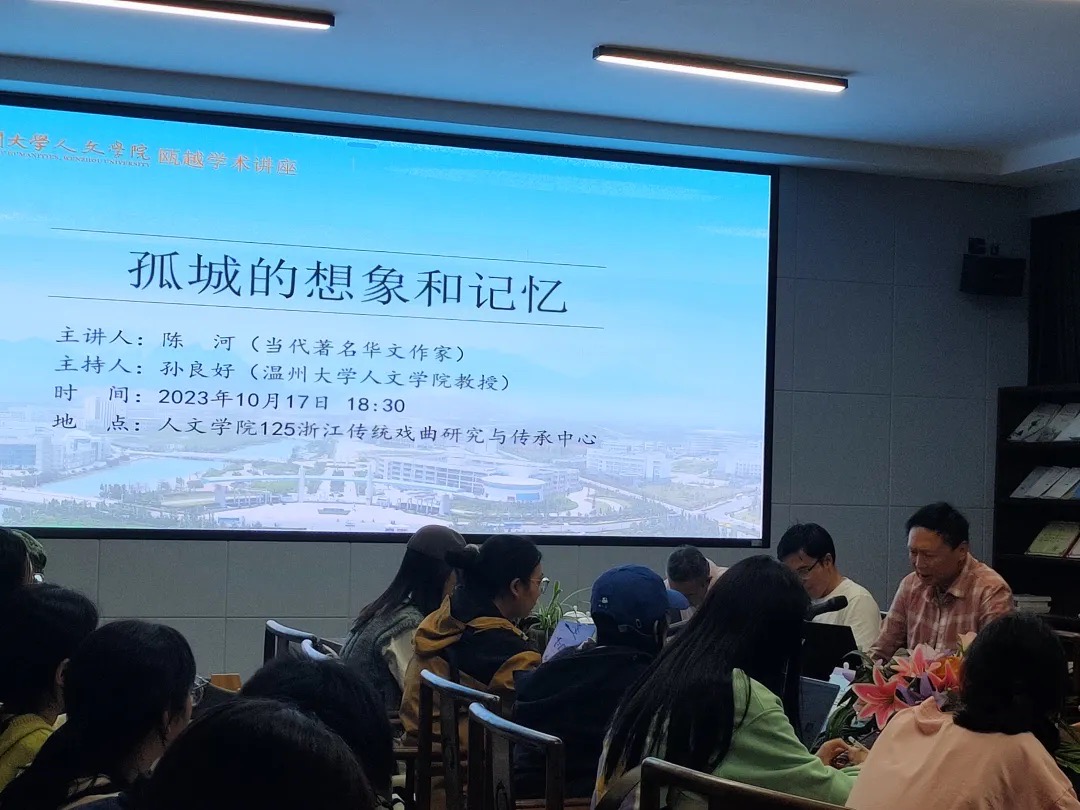 2023年10月17日晚,当代著名华文作家陈河应邀在德赢官网125浙江传统戏曲研究与传承中心举行了题为《孤城的想象和记忆》的讲座。本次讲座由德赢官网院长孙良好教授主持。