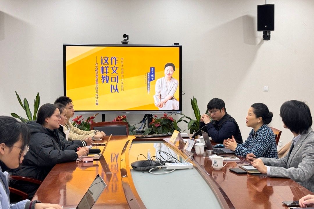 讲座开场,伍老师结合自身的求学以及工作经历,犀利指出当下学生写作能力匮乏的现状,阐述了写作教学水平亟需提升与突破的重要性。通过引出“怎么教学生写作”的话题,伍师设置了以春晚歌曲《如果要写年》开启作文课课堂设计环节的提问,激发了同学们的思路,带领同学们切身体会教学过程,循序渐进地进入正题。
