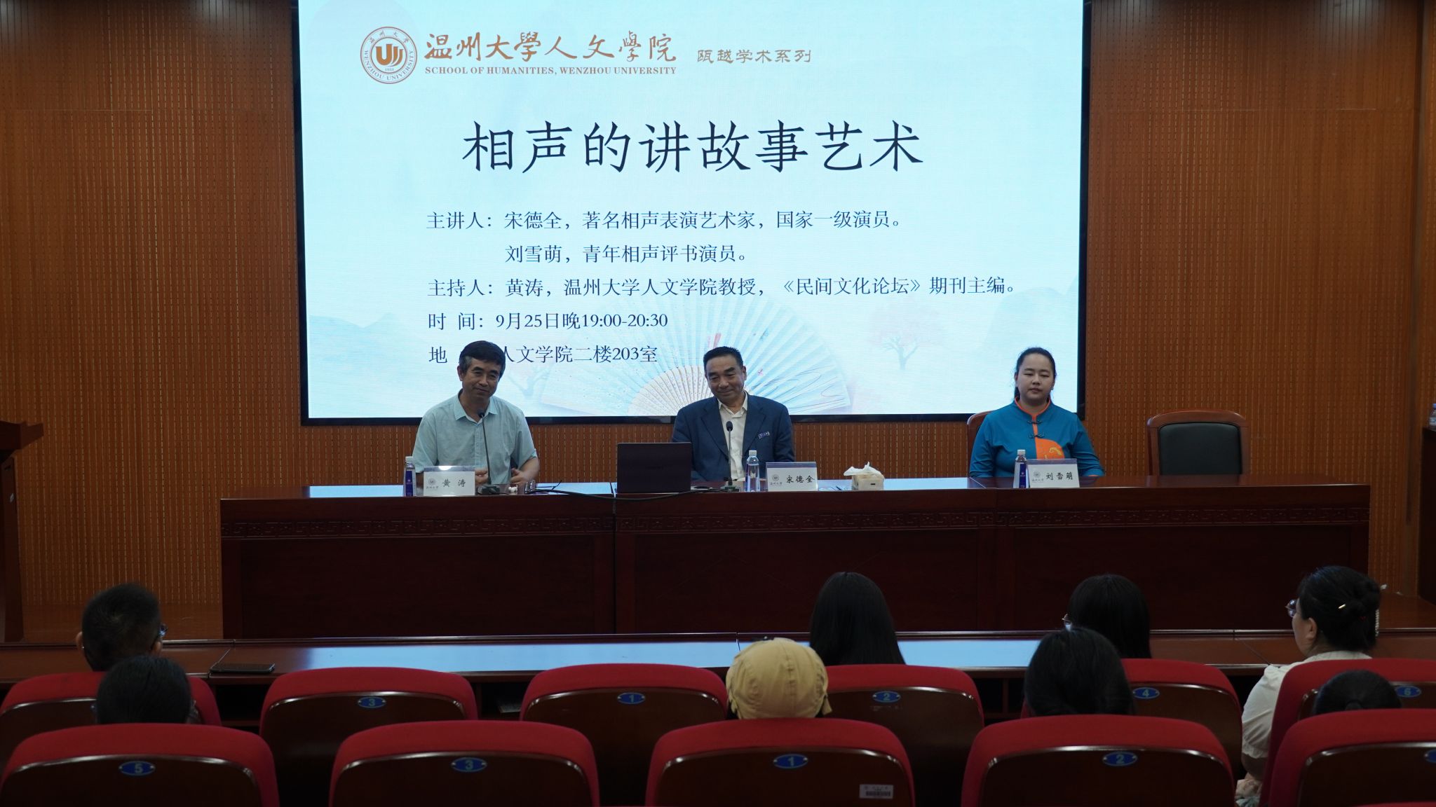 2024年9月25日晚,著名相声表演艺术家,国家一级演员,宋德全先生和青年相声评书演员刘雪萌女士,应德赢ac米兰官方合作vwin、温州民俗博物馆邀请,在德赢官网203学术报告厅,作了一场题为“相声的讲故事艺术”的学术讲座。本次讲座由黄涛教授主持,程安霞老师、王辉老师,温州市委党校胡正裕老师出席,德赢官网各专业研究生、本科生积极参加。