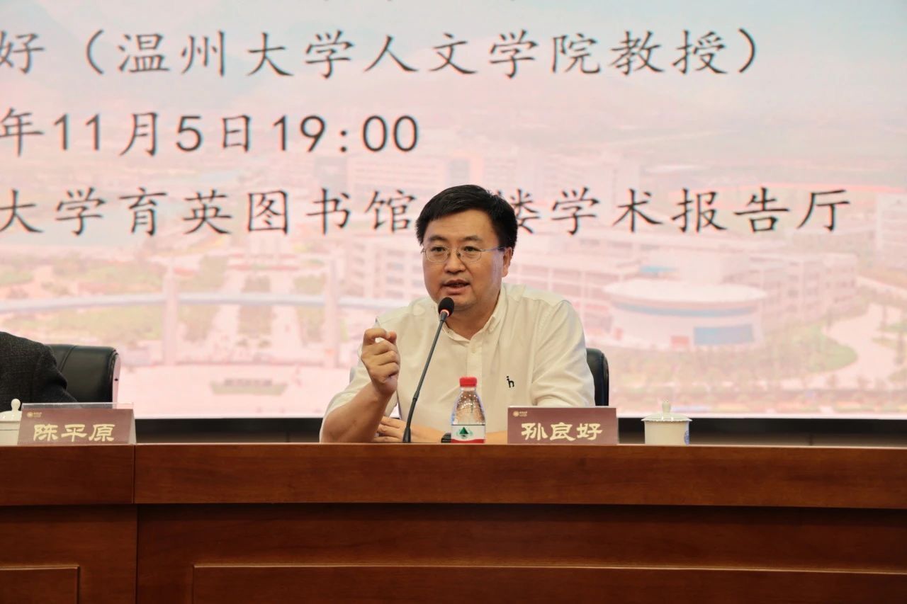 主持人孙良好教授用“十年之约”“联袂而来”“三位一体”三个词介绍了陈平原教授与罗山讲堂的因缘。第一,“十年之约”是指陈平原教授接受了孙良好教授十年之约的邀请,自2014年春天做客罗山讲堂后,再一次来到了德赢ac米兰官方合作vwin;第二,“联袂而来”是指陈平原教授与夏晓虹教授这对中国文学研究界的“神雕侠侣”,自2014年4月15日晚上在温大图书馆分别以“烽火连八年,弦歌抵万金——中国大学西迁的历史及精神”和“二十世纪秋瑾文学形象的变迁”为题讲演后,再次联袂来到德赢ac米兰官方合作vwin。第三,孙良好教授认为陈平原教授是集文学、大学、读书为一体的学者,他说:“陈平原教授是国内少有的文科一级教授,不仅是文学研究的大家,也是大学研究的大家,还有很多与读书相关的著述。在我看来,文学、大学、读书在陈老师身上是三位一体的,是水乳交融的。”