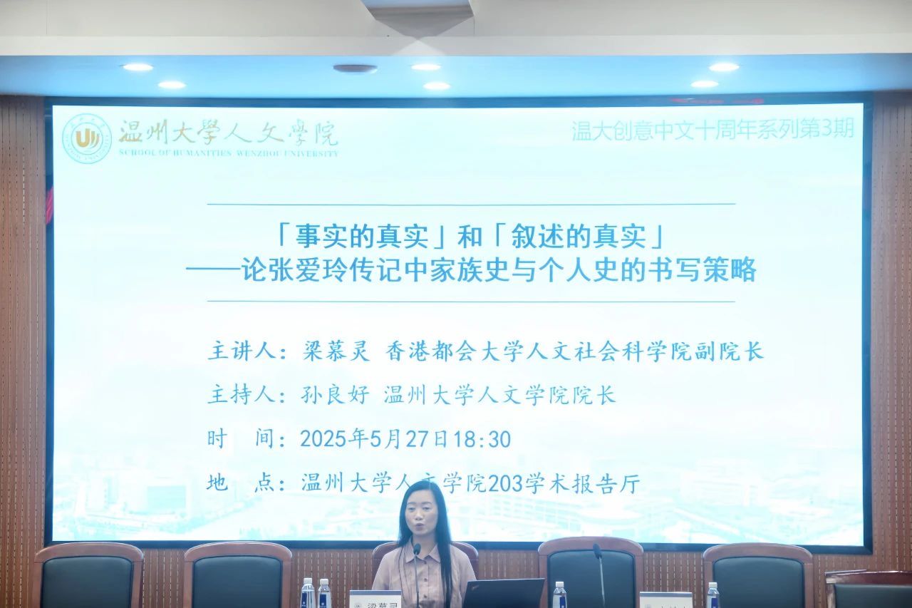2025年5月27日晚,我院特邀香港都会大学人文社会科学院副院长、田家炳中华文化中心主任梁慕灵,在203学术报告厅开展以“‘事实的真实’和‘叙述的真实’——论张爱玲传记中家族史与个人史的书写策略”为主题的讲座。讲座由我院院长、图书馆馆长孙良好教授主持,参与讲座的听众有香港都会大学人文社会科学院的邵栋博士、余文翰博士、德赢ac米兰官方合作vwin创意中文系副主任李广旭老师、刘卫东老师以及本研学生。现场师生积极参与学习与讨论,学术氛围浓厚。