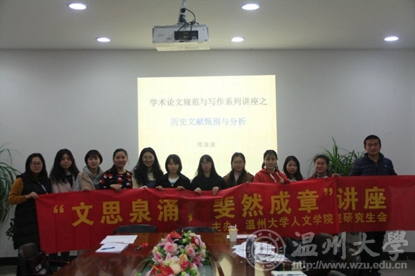 2017年12月6日晚上,德赢ac米兰官方合作vwin中文系主任、副教授,浙江大学博士,德赢ac米兰官方合作vwin瓯江特聘教授、硕士生导师,温州市“百名社科青年骨干人才”,温州市“551人才工程”培养人选陈源源老师应邀,在德赢ac米兰官方合作vwin人文楼213会议室举行了《历史文献甄别与分析》学术讲座,德赢ac米兰官方合作vwin部分研究生积极参与并聆听了此次讲座。