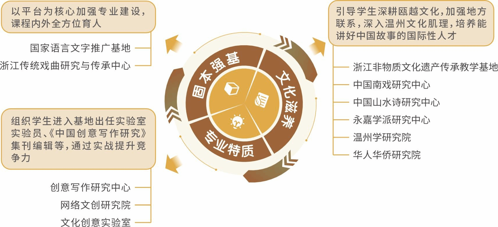 本专业实现中文、历史、广告等专业资源共享,罗山讲堂、瓯越学术讲座等提供前沿学术资源,国家语言文字推广基地等教研基地引导学生融入地方,“瓯语史”“《温州大典》研究编纂工程”等科研项目提供学生实践机会,打造“文学周”“百年语文”等七大校园文化品牌,“知语识文”国家通用语言文字推广等活动培养学生实战能力,已出版学生作品集《文字作坊》9辑、《文轩》16期、文学奖十周年作品选《拾年》等。借助温大创意写作研究中心、网络文创研究院等平台加强与地方联动,举办写作工坊、作家分享等学术活动组织学生参与专业发展,对接数创空间等文创市场组织学生参与行业发展,锻造学生的专业特质。将课堂搬进世界温州人家园、瓯海数创园等文创园区,开设剧本杀集训营等产业培训,邀请行业专家进实践课堂,推荐学生入企见习实习,助力学生成长成才。