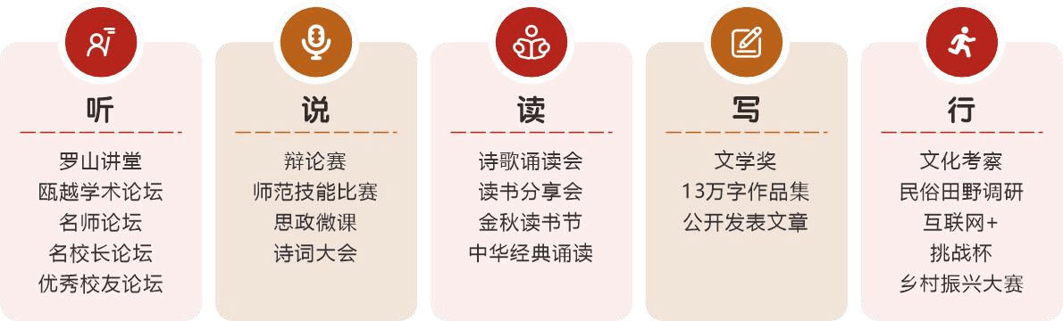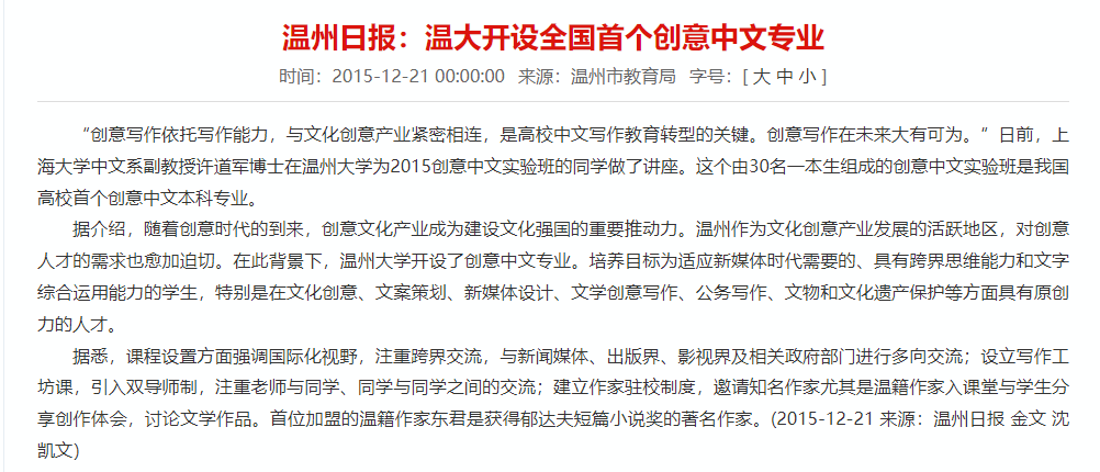 德赢ac米兰官方合作vwin汉语言文学(创意中文实验班)系入选国家一流本科专业建设点的汉语言文学专业的方向之一,文脉可以追溯到晚清教育家孙怡让先生于1906年创办的温州师范学堂。2015年,德赢ac米兰官方合作vwin汉语言文学专业创设创意中文实验班,成为国内最早进行中文创意写作教育教学和人才培养的高校之一。2016年建设驻校作家制度;2019年入选国家一流本科专业建设点;2021年成立温大创意写作研究中心,与上海大学、香港都会大学联合打造《中国创意写作研究》集刊的学术平台。拥有教育部国家语言文字推广基地、浙江省哲学社会科学重点A类研究基地“浙江传统戏曲研究与传承中心”等。专业以传统中文为基底,整合文史哲和文化创意资源,强化写作实践教学,致力于培养专业知识和人文素养“双优”、口头表达和书面写作“双高”、文学创作和文创生产“双强”的“三双”应用型高级人才。