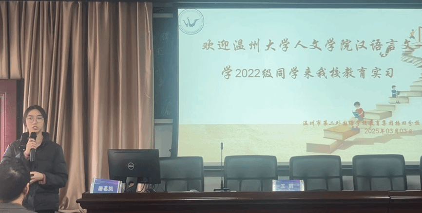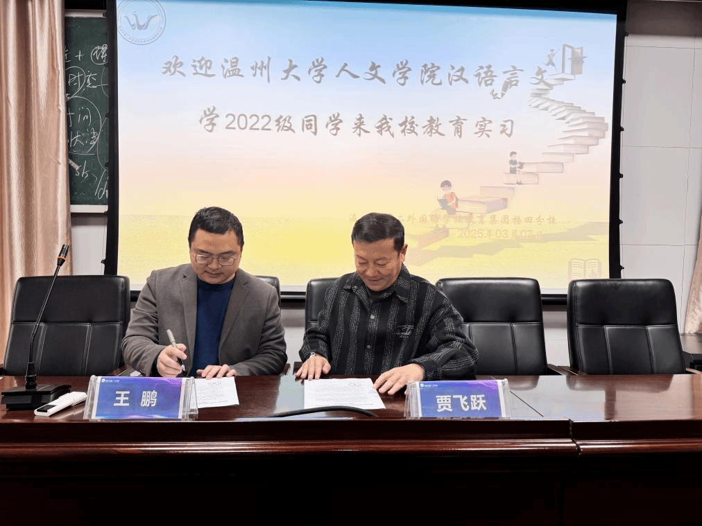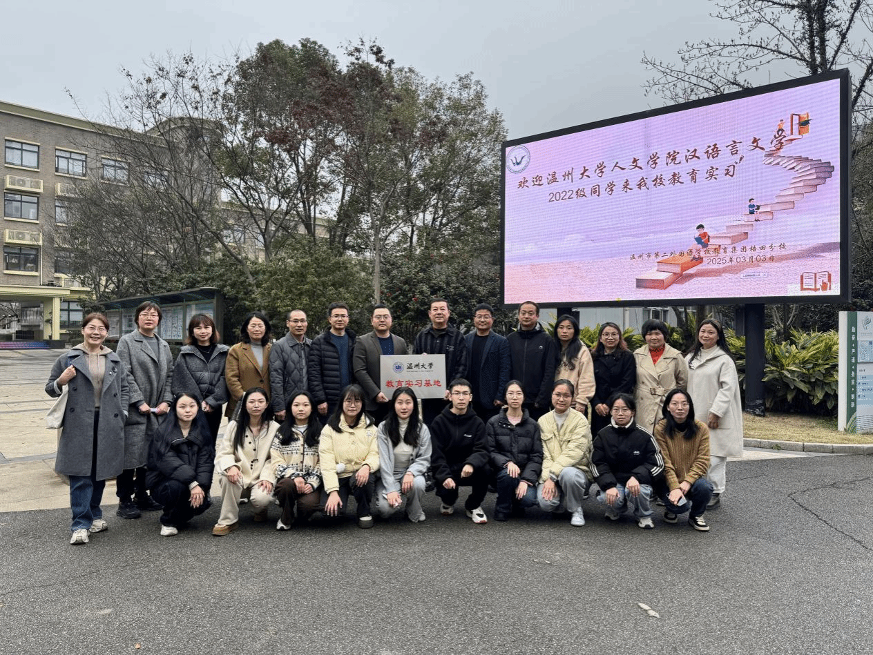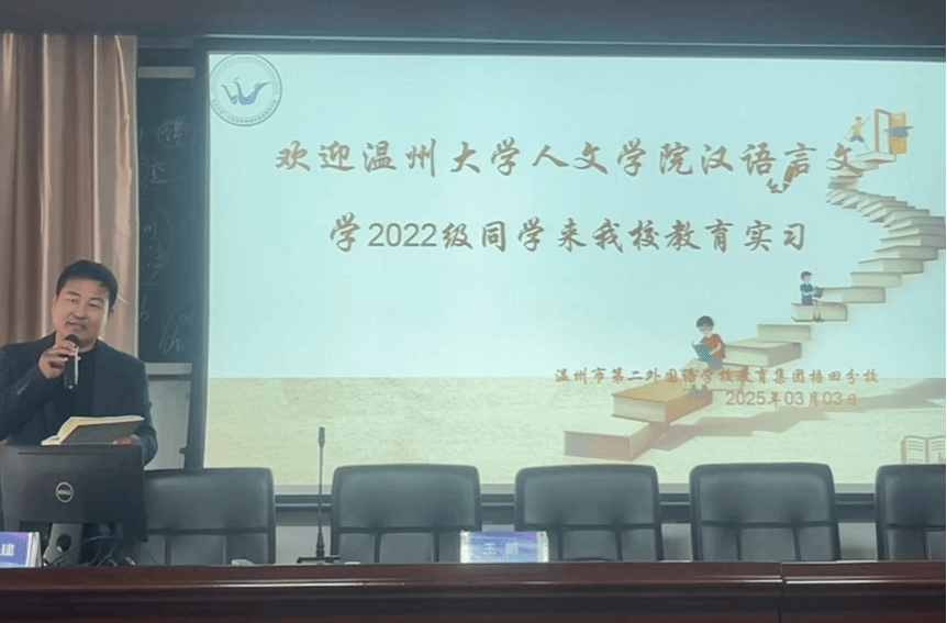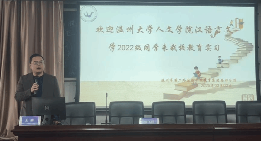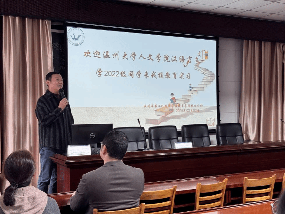 三月,万物复苏,春天一点一点地化开。在这个充满生命的季节里,22中文1班的8位同学迎来了将理论转化为实践的锻炼机会。2025年3月3日,在温州市第二外国语学校教育集团梧田分校与德赢ac米兰官方合作vwin汉语言文学(师范)专业2022级学生教育实习工作启动仪式在温州市第二外国语学校教育集团梧田分校南二楼教师会议室举行。见面会由温州市第二外国语学校教育集团梧田分校教学科研处主任金红蕾老师主持,参与本次见面会的人员有德赢ac米兰官方合作vwin的王鹏副院长、陈柳老师和温州市第二外国语学校教育集团梧田分校校长贾飞跃、副校长陈荣建、指导老师们和全体实习生。