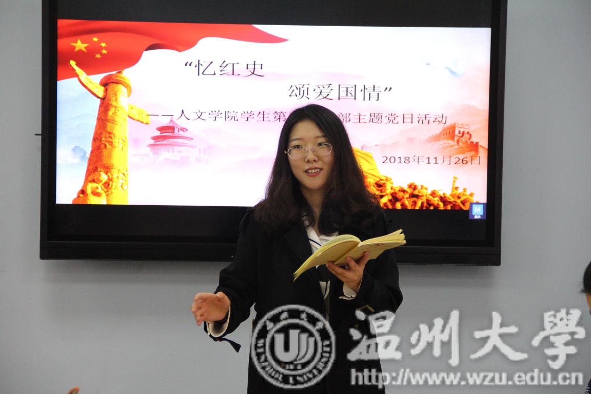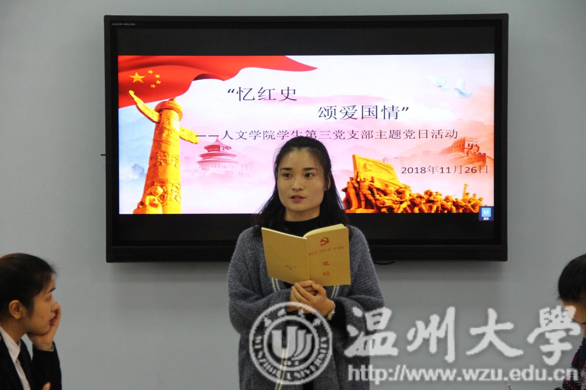 11月26日下午,德赢官网学生第三党支部在外语楼党员之家221会议室成功召开了“忆红色革命史,颂爱国主义情”主题党日活动。本次党日活动由支部书记徐珍主持,学生第三党支部全体党员参加。