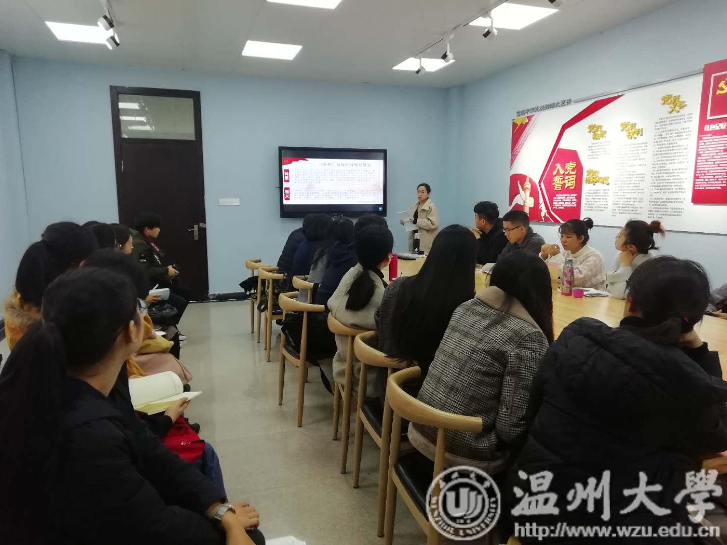 2018年12月23日下午,德赢官网学生第二党支部举行“学习《中国共产党支部工作条例(试行)》”主题党日活动。本次主题党日活动以党课的形式开展,由支部书记陈赛君进行宣讲。