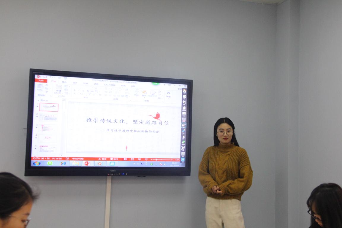 2019年1月6日晚上,德赢官网“星火·薪传”党员志愿服务中心之国学社携手学生第一党支部,于北校区外语楼221党员之家会议室举办了“推崇传统文化,坚定道路自信,习近平用典中核心价值的构建”主题宣讲活动。本次宣讲活动由国学社成员曹清清进行宣讲,由德赢官网学生第一党支部书记李林军主持。