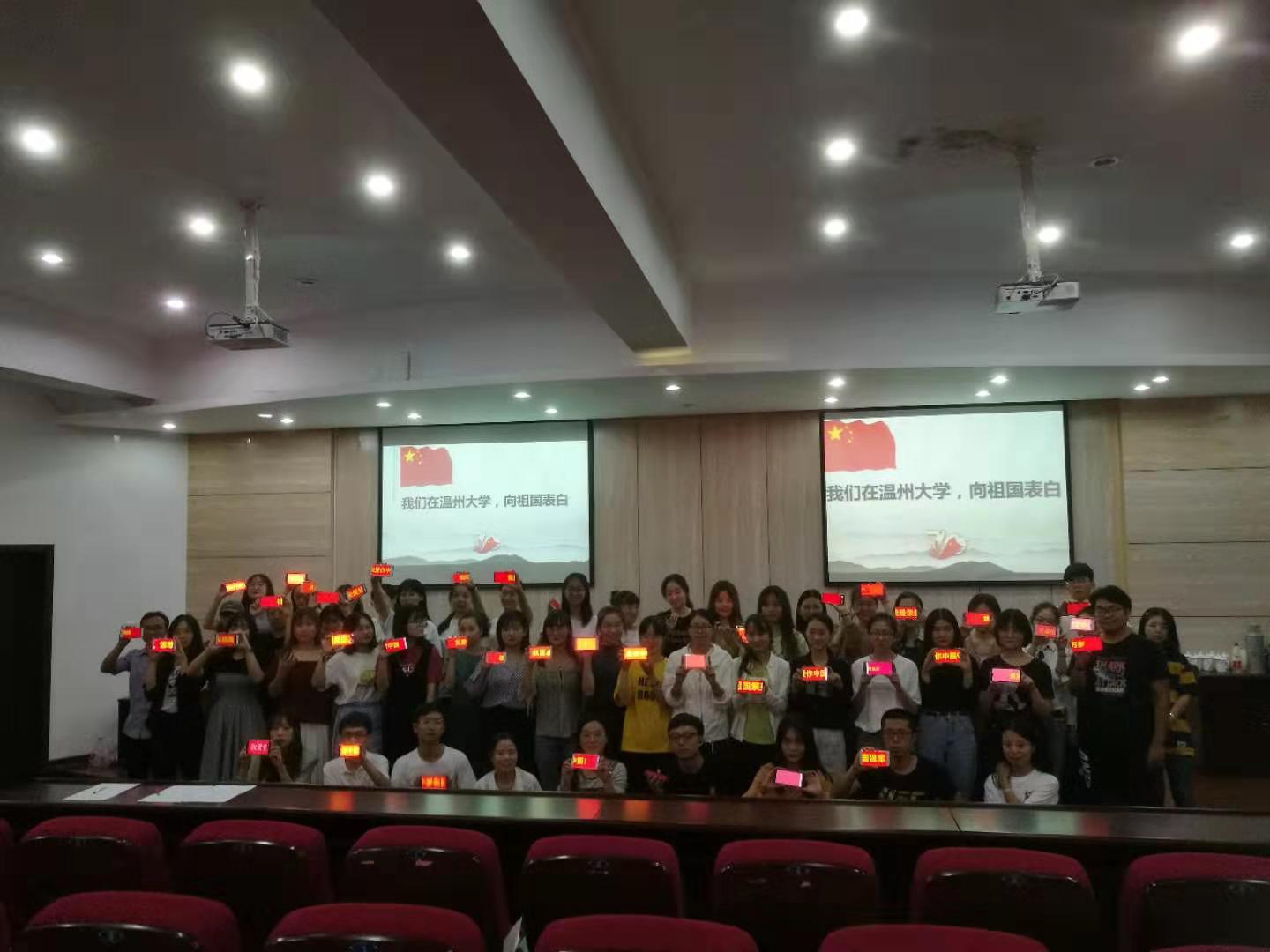 “星火·薪传”党员志愿服务中心举办了“人文学子心,悠悠爱国情”主题教育活动。党员同志集体朗诵诗歌《人间正道是沧桑》,齐唱歌曲《歌唱祖国》。国学社的陈雅丽同学作了《谈初心、担使命,诉衷情》主题演讲。在重温了入党誓词、重忆了入党经历、重问了入党初心、重申了入党使命之后,每名党员同志也都反思自己能否达到敢承诺、敢作为、敢担当、敢奉献的党性要求。初心,立于危难,镌刻信念;使命,贯穿今生,铸就信仰。活动最后,全场同志一起在聆听着来自56个民族人民对祖国真挚的告白,同时在手机中打出自己对祖国的表白语,共同呐喊出对祖国的祝福。