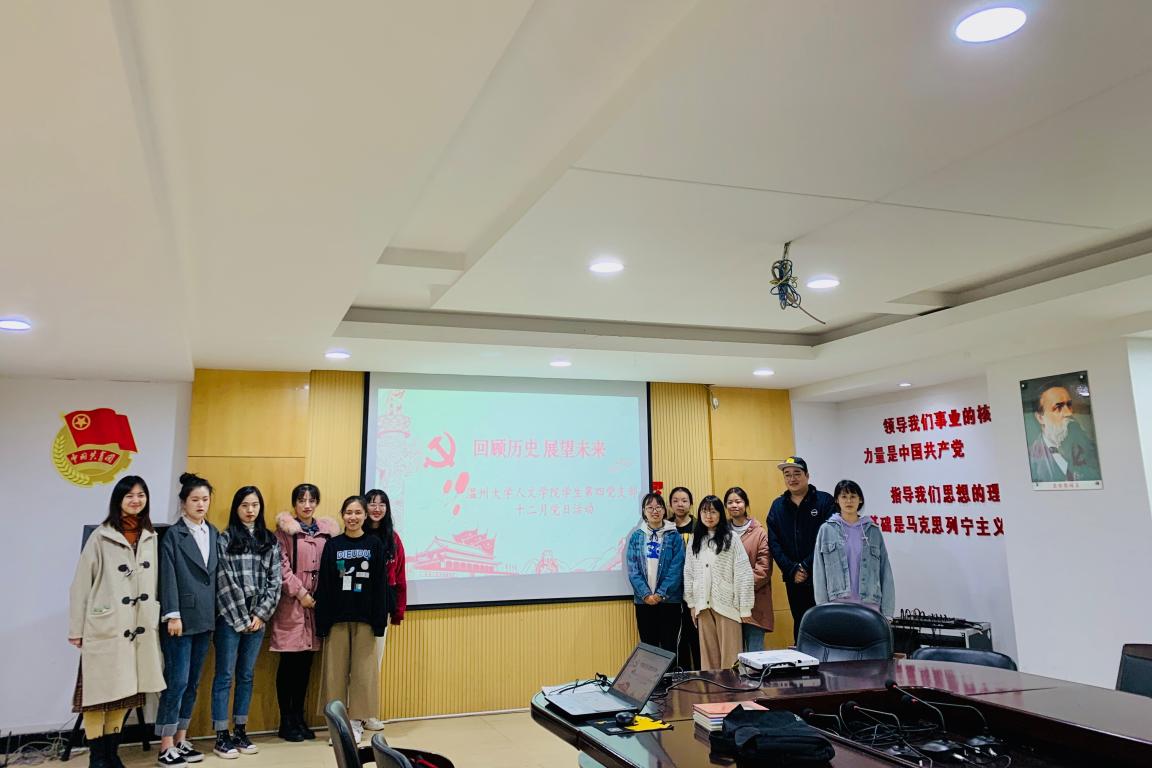 2019年12月15日,德赢官网学生第四党支部的十三位同志相聚在超豪学区四号楼党员之家,开展了一场以“回顾历史,展望未来”为主题的党日活动。在党史知识的趣味竞答过程中,各位党员强化了对党的理论认识,从党史中学习了经验和方法,进而更好地展望未来。