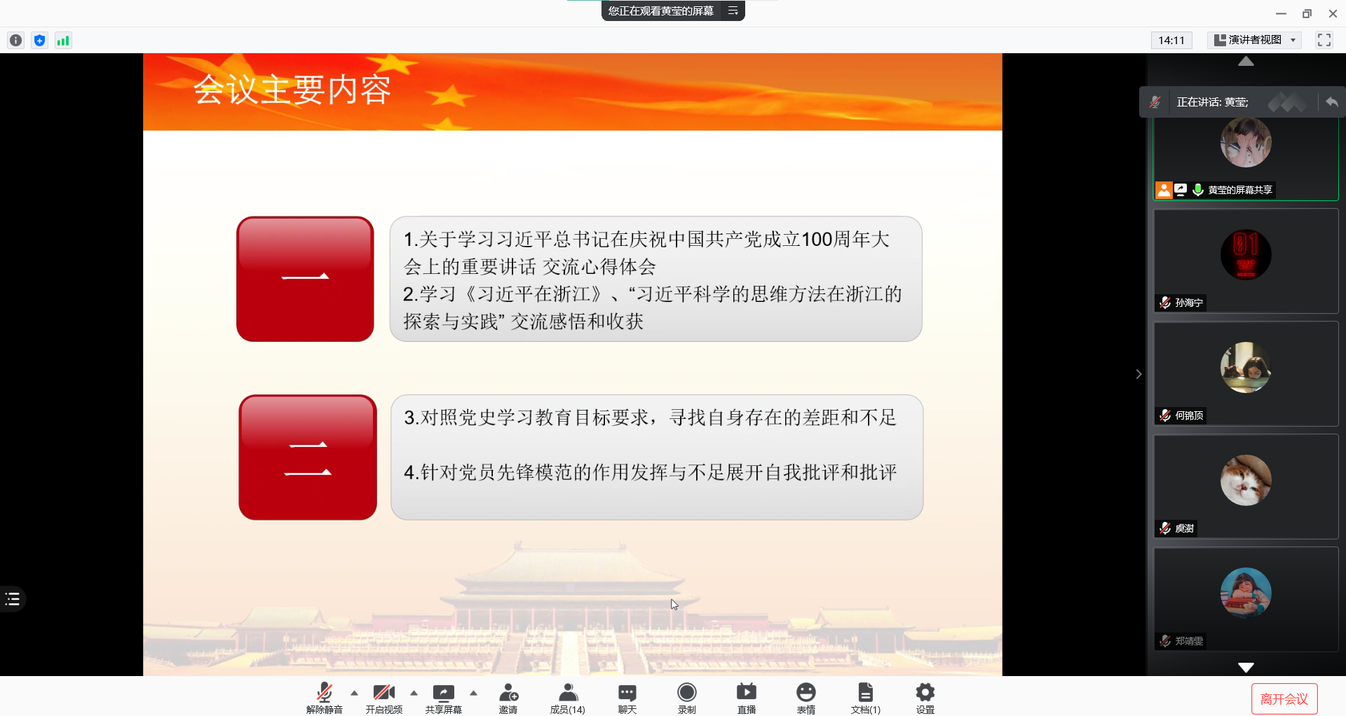 在防控疫情的特殊时期里,本次组织生活会以党史学习教育为专题,组织各位同志结合《习近平总书记在庆祝中国共产党成立100周年大会上的重要讲话》与《习近平在浙江》系列文章进行学习和交流心得,同时每位同志也结合具体学习内容,参照党史学习教育目标要求与党员先锋模范的作用发挥方面找寻自身存在的不足和差距。支部同志们在本次心得汇报中准备充分,在发言中能够体现出深刻的体会与感想。同志们在《习近平总书记在庆祝中国共产党成立100周年大会上的重要讲话》的学习中,集中表达了对祖国繁荣昌盛的喜悦,与作为共产党人,与党中央保持高度一致,继续践行为人民谋幸福、为民族谋复兴的伟大使命。同志们在对《习近平在浙江》系列文章进行充分学习后,结合我校地处浙江的现实进行思考,对“八八战略”与习近平总书记在浙江的科学思维方法进行了充分理解。