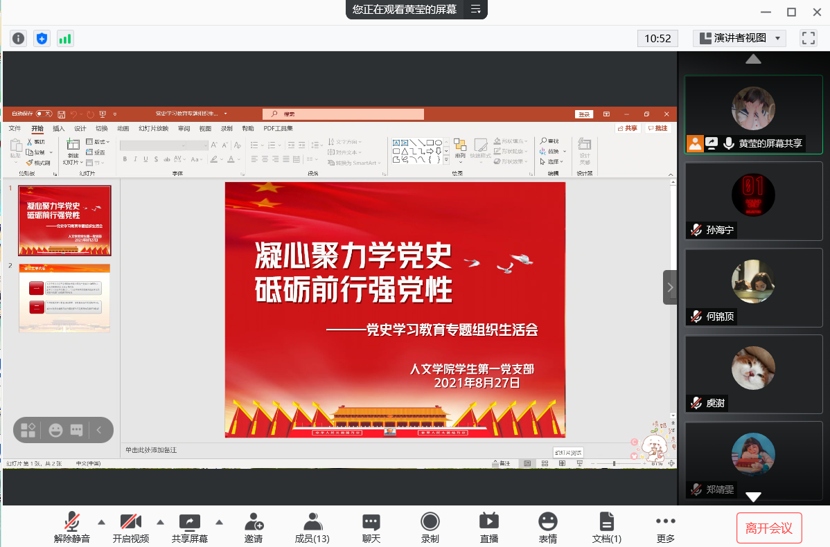 2021年8月27日,在全国疫情形势仍然紧张的特殊时期里,德赢ac米兰官方合作vwin学生第一党支部首次采用线上会议形式举办了党史学习教育专题组织生活会,并由支部书记黄莹主持。