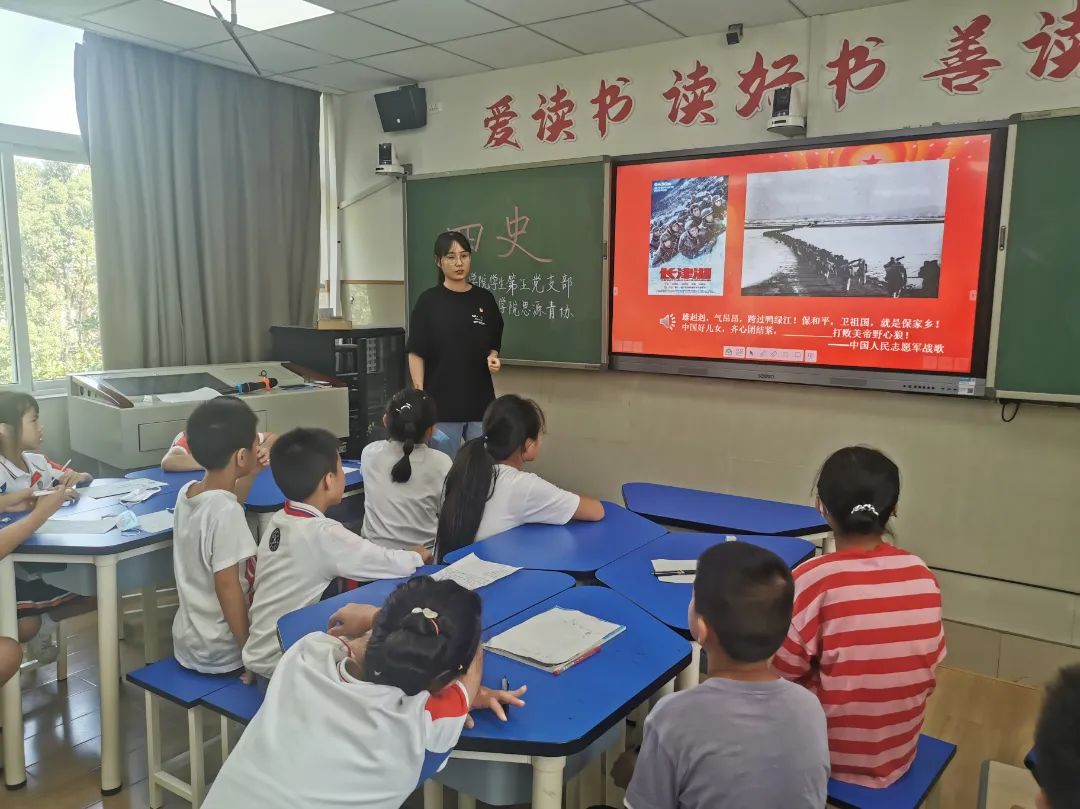 “中华民族是崇尚英雄、成就英雄、英雄辈出的民族”,英雄们的事迹和精神是激励中华民族前行的强大动力。“雄赳赳,气昂昂,跨过鸭绿江……”随着中国人民志愿军战歌音乐的响起,叶奕雯同志向孩子们介绍抗美援朝的经过,并重点讲述了战斗英雄黄继光的事迹。孩子们从中深刻认识到每一个为国捐躯的生命背后都有不应被遗忘的英勇故事。课堂过程中,孩子们对历史故事充满着无穷无尽的好奇心,纷纷举手发言提问。
