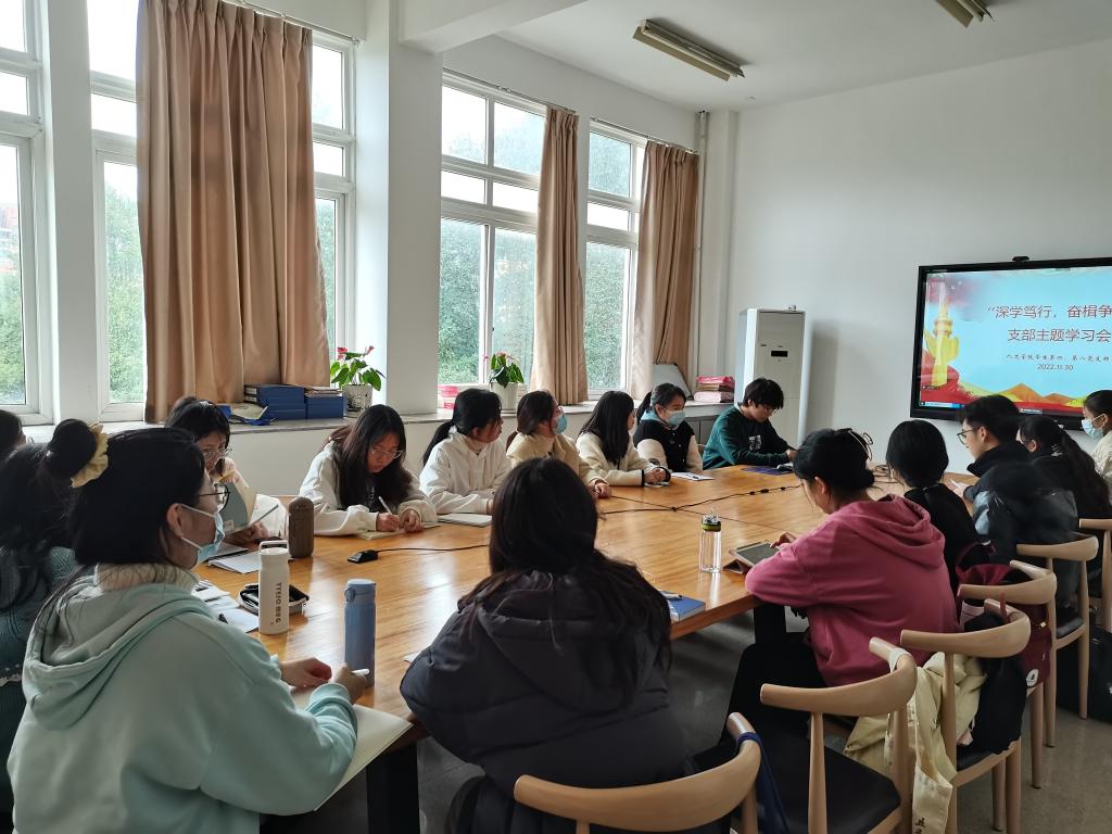 为深入学习贯彻党的二十大精神,提高支部党员的党性修养,2022年11月30日,德赢ac米兰官方合作vwin学生第四、第八党支部在人文楼214党员之家举办了以“深学笃行,奋楫争先”为主题的党日活动暨学习会。本次会议由朱宁恺同志主持,14名党员同志和6名入党积极分子参加。