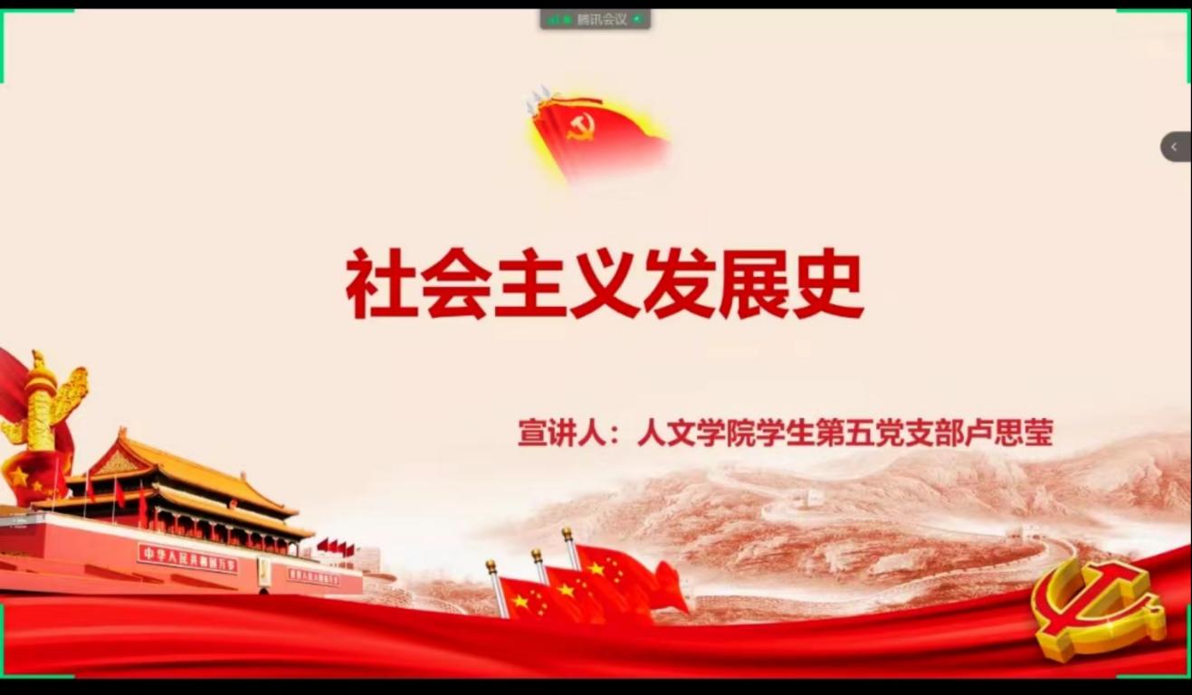 为引导广大青年进一步了解社会主义的发展历史,传承中华优秀民族精神,12月14日下午14:00,在腾讯会议举行的2022-2023学年德赢ac米兰官方合作vwin第五期团干培训中,德赢官网学生第五党支部卢思莹同志以“社会主义史”为主要内容,做了题为《社会主义发展史》的宣讲。