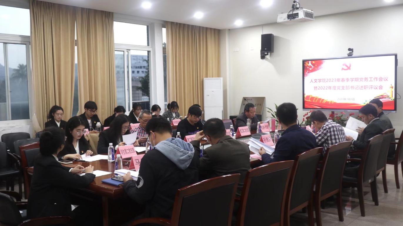 为深入学习贯彻党的二十大精神,落实党建工作责任制,推进基层党建工作,3月9日晚,德赢ac米兰官方合作vwin2022年度党支部书记述职评议会暨新学期党务工作会议在人文楼213会议室召开,总结盘点2022年党支部书记履职情况,全面部署新学期学院党建工作。学院全体党委班子成员、师生党支部书记参加会议,副书记魏一同志主持会议。