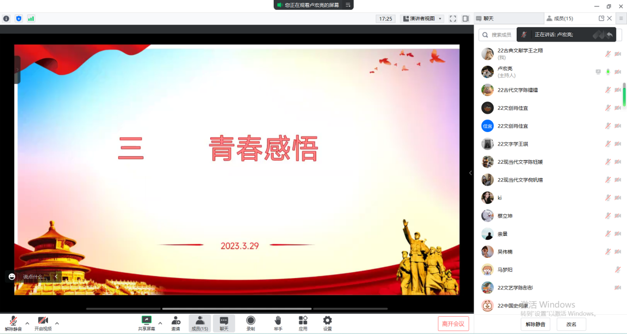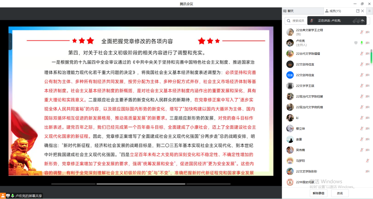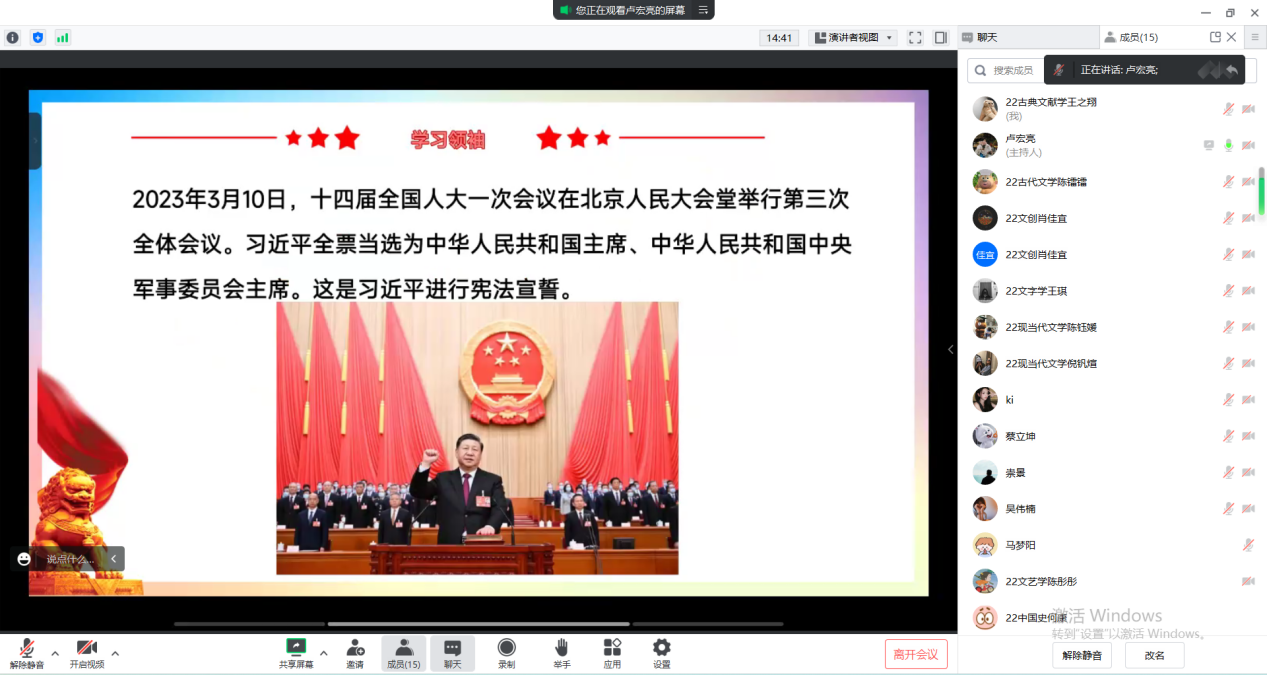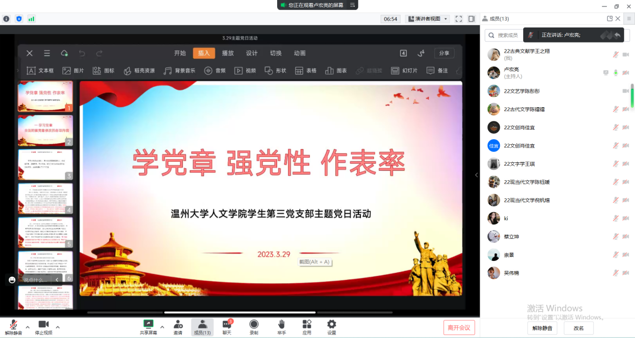 2023年3月9日16点,德赢ac米兰官方合作vwin学生第三党支部于线上召开“学党章、强党性、作表率”主题党日活动。本次党日活动由支部宣传委员卢宏亮主持,共有16位党员参加。活动共分为以下三项内容。