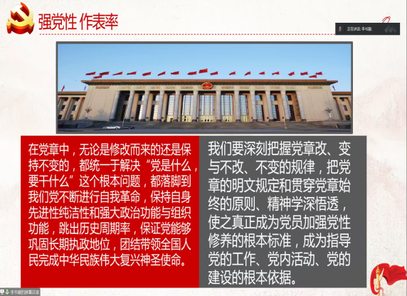 为深入贯彻学习党的二十大精神,全面领会把握新修订的《中国共产党章程》的深刻内涵,引导学生党员自觉学习并遵守各项党章党规,坚决拥护党的纲领,德赢官网学生第六党支部于4月11日晚开展“学党章 强党性 作表率”主题党日活动。活动由党支部书记周梦淏主持。
