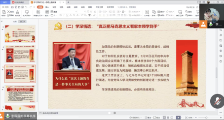 学思用贯通、知信行统一。2023年6月21日,德赢ac米兰官方合作vwin学生第八党支部开展学习贯彻习近平新时代中国特色社会主义思想主题教育线上宣讲活动。本次活动由学生第八党支部书记李露露主持,应参加党员数7人,实际参加党员数6人。