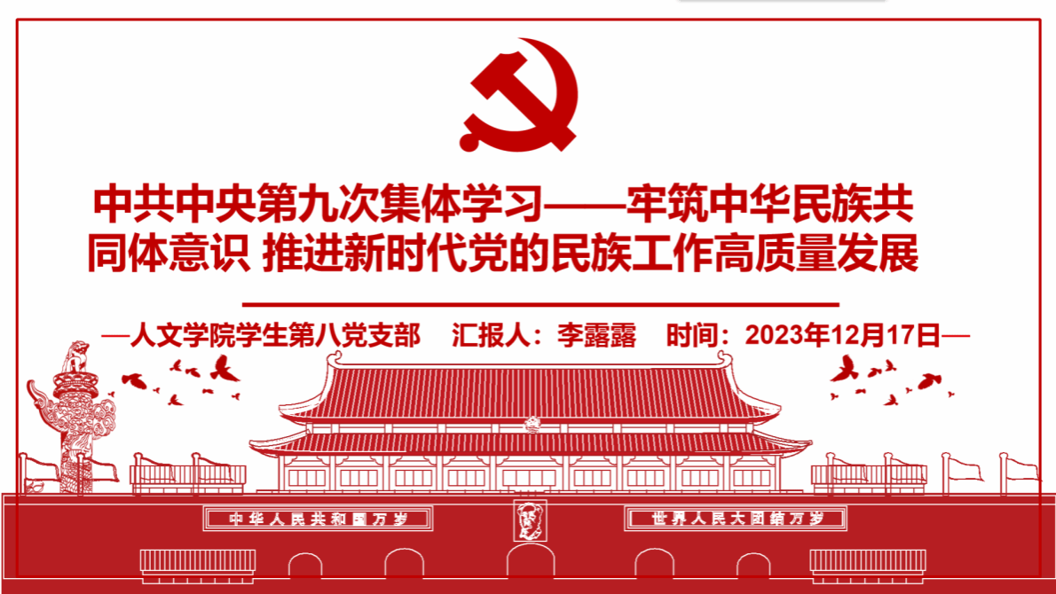 为深入学习习近平总书记在中共中央政治局第九次集体学习时的重要讲话精神,推动学习贯彻习近平新时代中国特色社会主义思想主题教育走深走实,推动深化政治理论学习入心入脑、走深走实、见行见效,2023年12月17日晚,德赢ac米兰官方合作vwin学生第八党支部于腾讯会议开展了“铸牢中华民族共同体意识,推进新时代党的民族工作高质量发展”十二月主题党日活动。