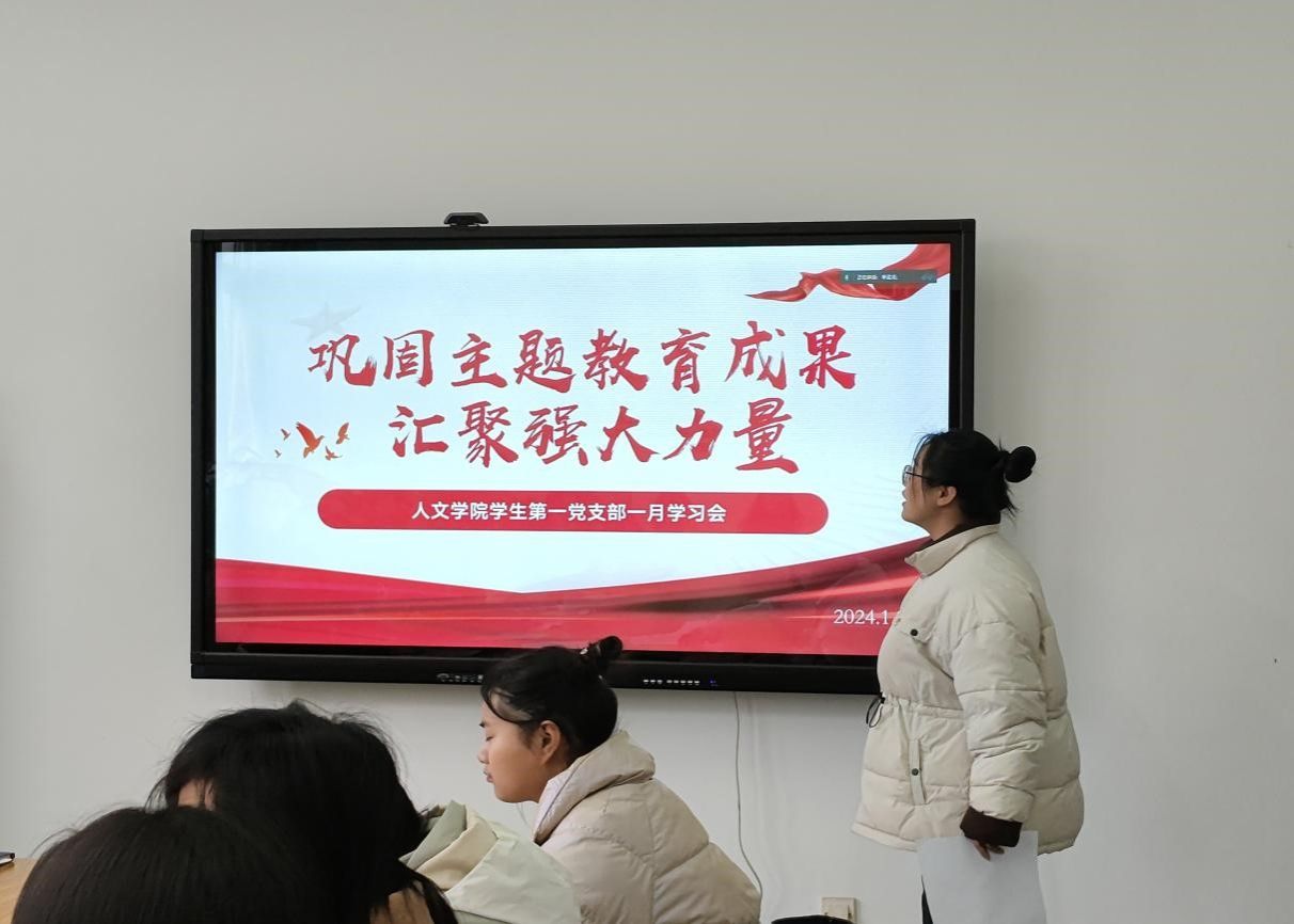 中共中央政治局于12月21日至22日召开学习贯彻习近平新时代中国特色社会主义思想主题教育专题民主生活会。为学习习近平总书记在会议上的重要讲话,深刻领悟中央政治局专题民主生活会精神,1月8日下午15:10,德赢ac米兰官方合作vwin学生第一党支部于人文楼214党员之家开展了以“巩固主题教育成果,汇聚强大力量”为主题的一月主题学习会。本次活动由袁璐婷同志主持,支部全体党员同志参加。