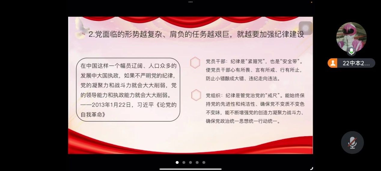 党纪学习教育是加强党的纪律建设、推动全面从严治党向纵深发展的重要举措。为深入学习贯彻习近平总书记关于党纪学习教育的重要讲话和重要指示精神,高质量开展党纪学习教育,2024年7月20日晚上19:00,德赢ac米兰官方合作vwin学生第一党支部在线上开展了以“党的纪律建设”为专题的学习会。本次活动由郑一笑同志主持,共有27名党员同志参加。