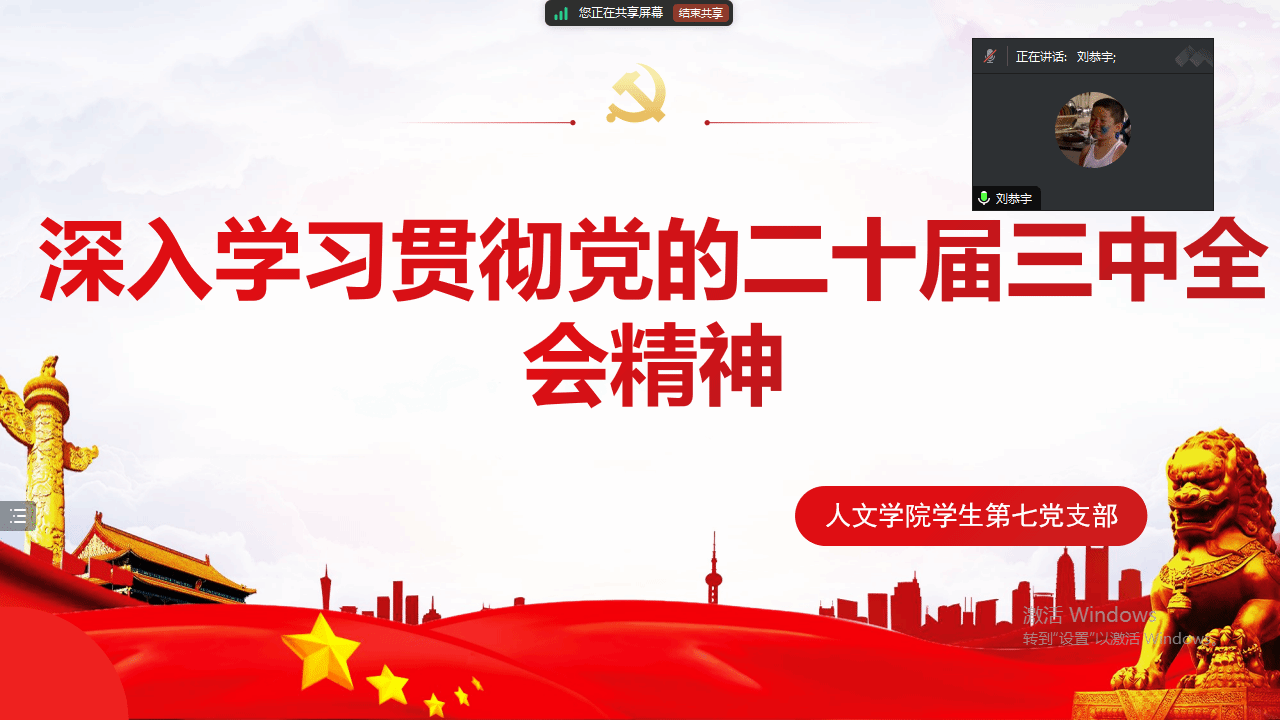 中国共产党第二十届中央委员会第三次全体会议(以下简称为党的二十届三中全会)于2024年7月15日至18日在北京召开。为深入学习贯彻此次全会精神,2024年8月6日晚,德赢官网学生第七党支部在线上开展了以“深入学习贯彻党的二十届三中全会精神”为主题的党日活动。会议由党支部书记刘恭宇老师主持。