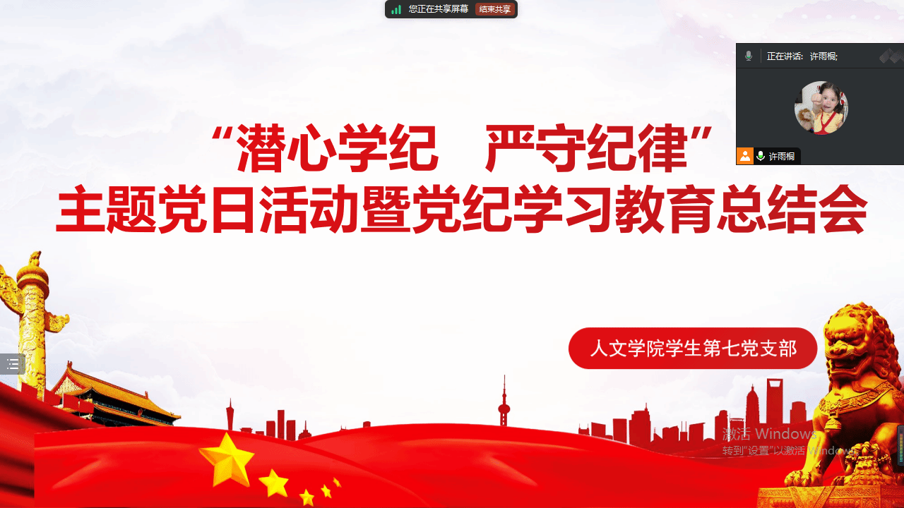 为深化“循迹溯源学思想促践行”行动,深入学习习近平总书记关于党纪学习教育的重要讲话和重要指示精神,推进党纪学习教育走深走实,取得实实在在的成效,2024年9月11日晚,德赢官网学生第七党支部在线上开展了以“潜心学纪 严守纪律”为主题的党日活动。会议由支部宣传委员许雨桐主持。