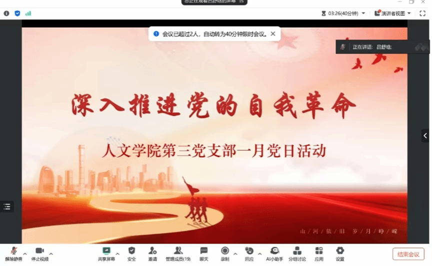为积极响应党的号召,深入学习贯彻习近平总书记关于党的自我革命的重要思想,2025年1月17日晚上,德赢ac米兰官方合作vwin学生第三党支部在线上开展了“深入推进党的自我革命”主题党日活动。本次活动由吕舒晗同志和陈嘉乐同志主持。