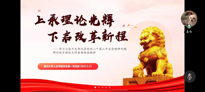 2025年2月21日晚上,德赢ac米兰官方合作vwin学生第一党支部举办了“上承理论光辉,下启改革新程”主题党日活动,通过学习习近平总书记在党的二十届三中全会精神专题研讨班开班仪式的重要讲话精神,不断深化对新时代全面深化改革的认识,进一步统一思想和行动。本次活动由聂唯同志主持,支部全体党员同志参加。