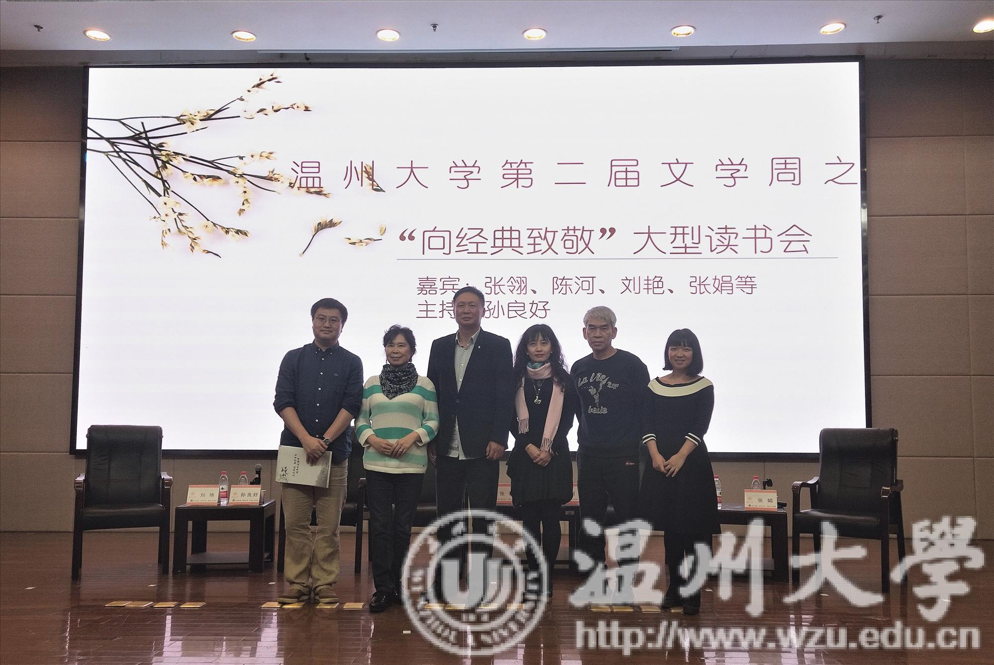 2018年11月15日18时30分,我校第二届文学周之“向经典致敬”大型读书会于育英图书馆学术报告厅举行。本次活动由德赢官网院长孙良好主持,驻校作家张翎、海外华人文学作家陈河、中国社会科学院博士刘艳、东南大学德赢ac米兰官方合作vwin副教授张娟以及当代著名作家王手受邀参加本次活动。
