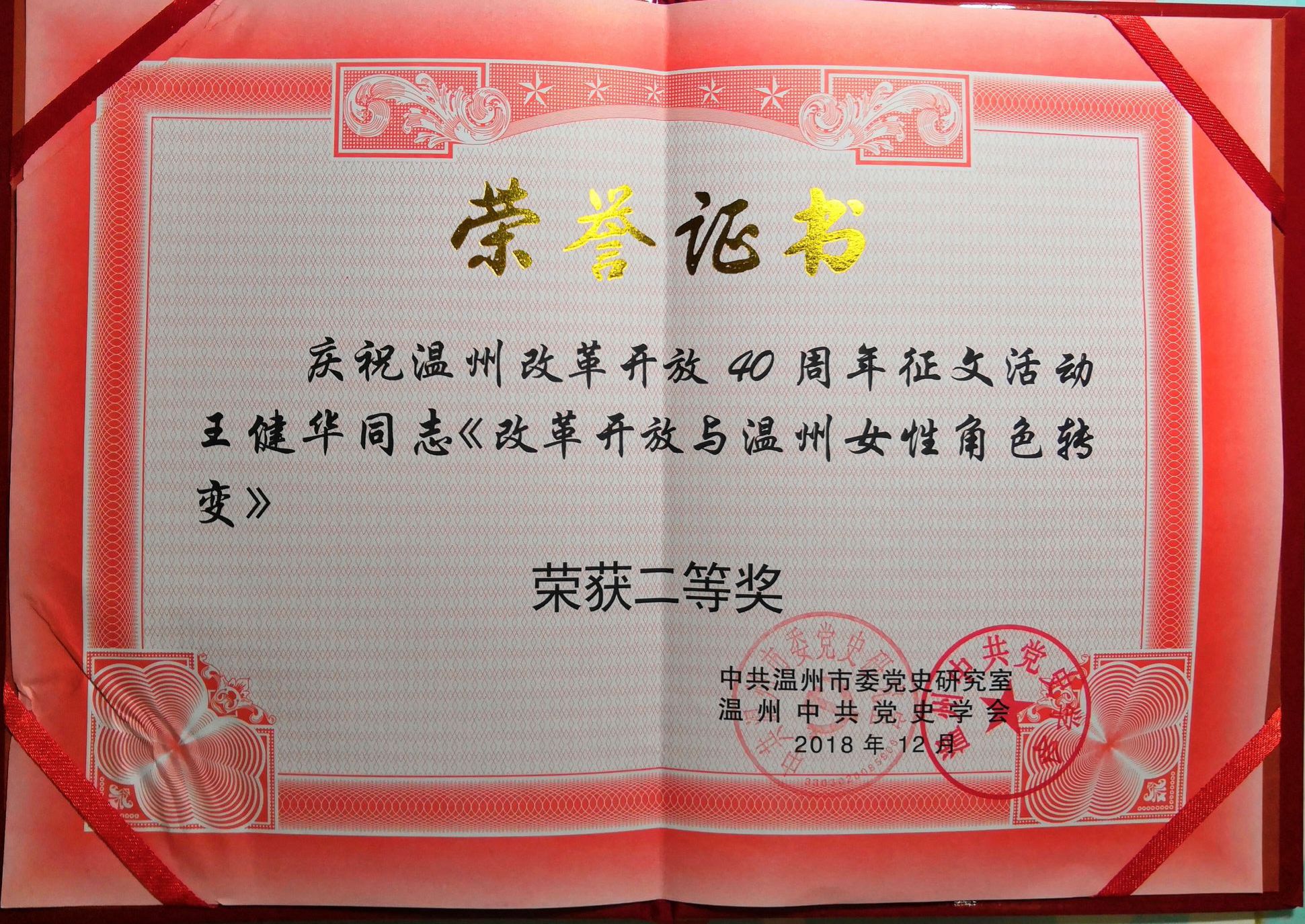 本次征文比赛从117篇应征文章中共评出特等奖3篇、一等奖2篇、二等奖4篇、三等奖6篇、优秀奖20篇。其中德赢官网16级中国史研究生王健华的文章《改革开放与温州女性角色转变》获二等奖;16级中国史研究生曾富城所整理应健雄口述文章《回顾温州交通银行发展历史》获三等奖;16级中国史研究生赵飞跃、陈学兵的文章《新时代改革开放以来温州民办博物馆的发展现状研究》,15历本杨苗苗的《温州人民改革开放后的创新创业精神》获得优秀奖。