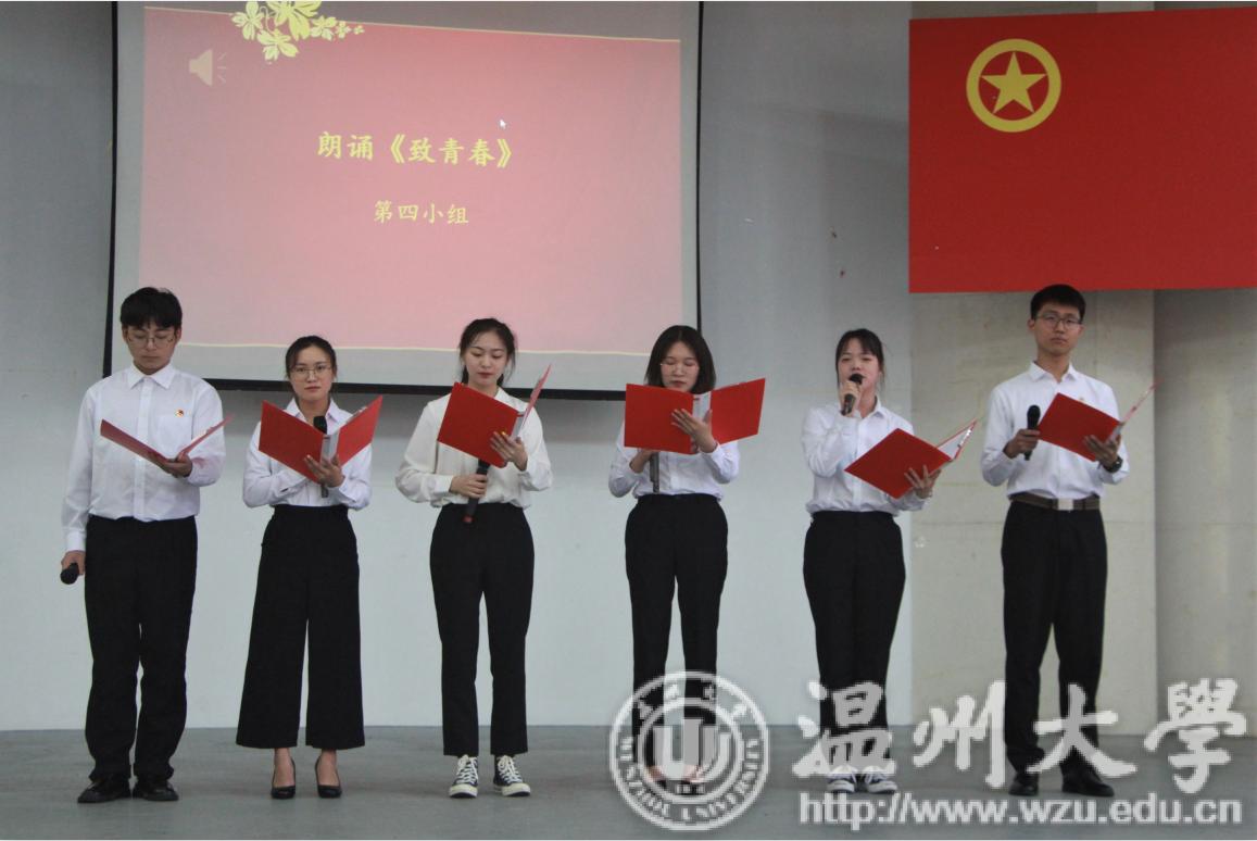 用青春拥抱时代,用生命点燃未来,“五四”的火炬奏响了团歌,拉开了此次团日活动的序幕。首先,由全体成员起立奏唱团歌并观看习近平总书记在五四运动100周年大会上重要讲话的视频片段。在观看的过程中,同学们认真思索,用手中的笔记录下了习近平总书记的深切教导。观看视频后,是围绕五四运动100周年历史而展开的知识问答环节,在回答的过程中,同学们积极展现出了团员青年应具有的知识储备和政治面貌。在之后的故事分享抢答环节中,各小组代表和大家一起分享了人民解放军刘英俊、民主战士鲁迅、乡村医生李春燕等优秀青年的故事,告诉大家青年要担负起强国的责任,并用诗朗诵《致青春》,点燃了在座同学们的斗志。接着,大家共同观看了温州师范学校的女学生所组成的新中国第一支“三八”女子石油测量队的故事,感受到什么叫做巾帼不让须眉,青年女子同样能挑大梁、战风霜、绘宏图,我校姑娘们在戈壁滩上谱写了一首首动人心弦的”石油之歌“。在之后的”一名优秀的青年应该具有什么样的品质“环节,同学们又用自强、创新、奉献等关键词道出了新时代青年人的梦想,最后,本次团日活动在《我和我的祖国》的歌声中结束。