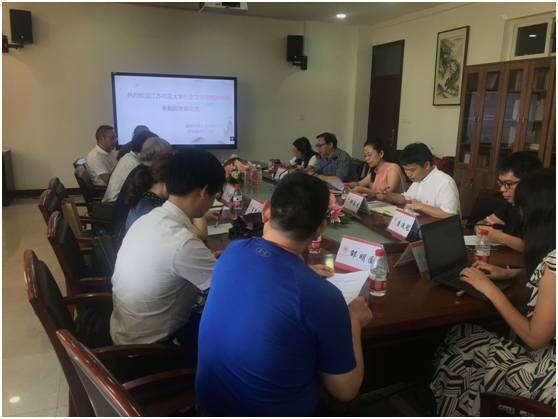 2019年8月12日下午,江苏师范大学历史文化与旅游学院院长张文德教授,国务院侨办侨务理论研究江苏基地常务副主任、教育部国别和区域研究中心(备案)澳大利亚研究中心主任、江苏师范大学华侨华人研究中心主任张秋生教授等一行8人来我校调研交流。在德赢官网213会议室,德赢ac米兰官方合作vwin研究生院院长刘玉侠教授、学生处副处长包含丽、德赢官网副院长郑春生教授和历史教研室张洁、唐运冠等老师热情接待了他们。双方围绕历史专业建设、人才培养和华人华侨研究等方面进行了深入交流。