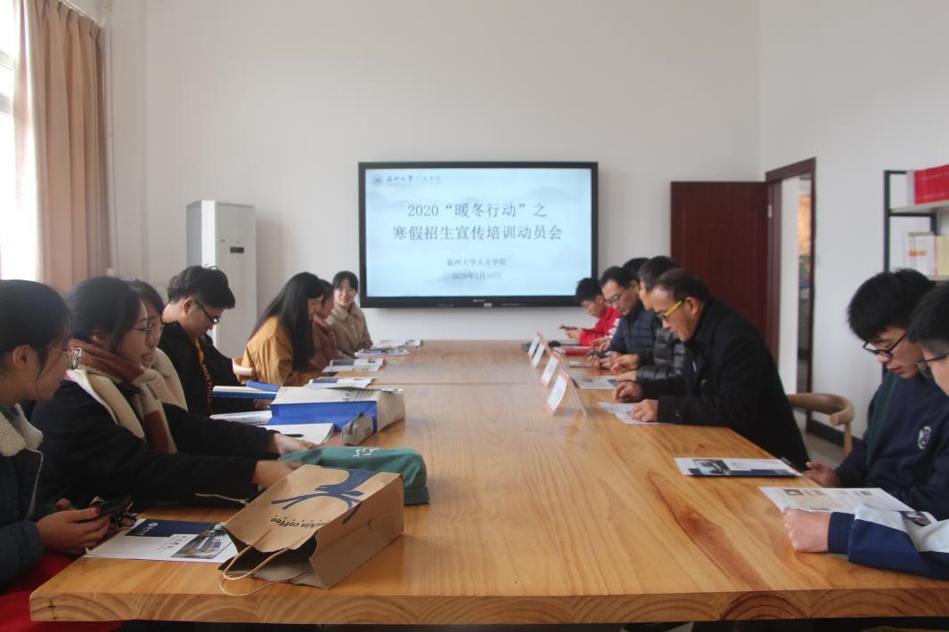 用青春温暖人心,用言语照亮归途。归时已是寒冬,来时一片春红。2020年1月10日上午,德赢官网2020“暖冬行动”之寒假招生宣传培训动员会在人文楼214举行,副院长郑春生教授、汉语言文学系主任洪之渊老师、广告学系主任黄良奇老师、学工办辅导员李丹萍老师出席本次会议。