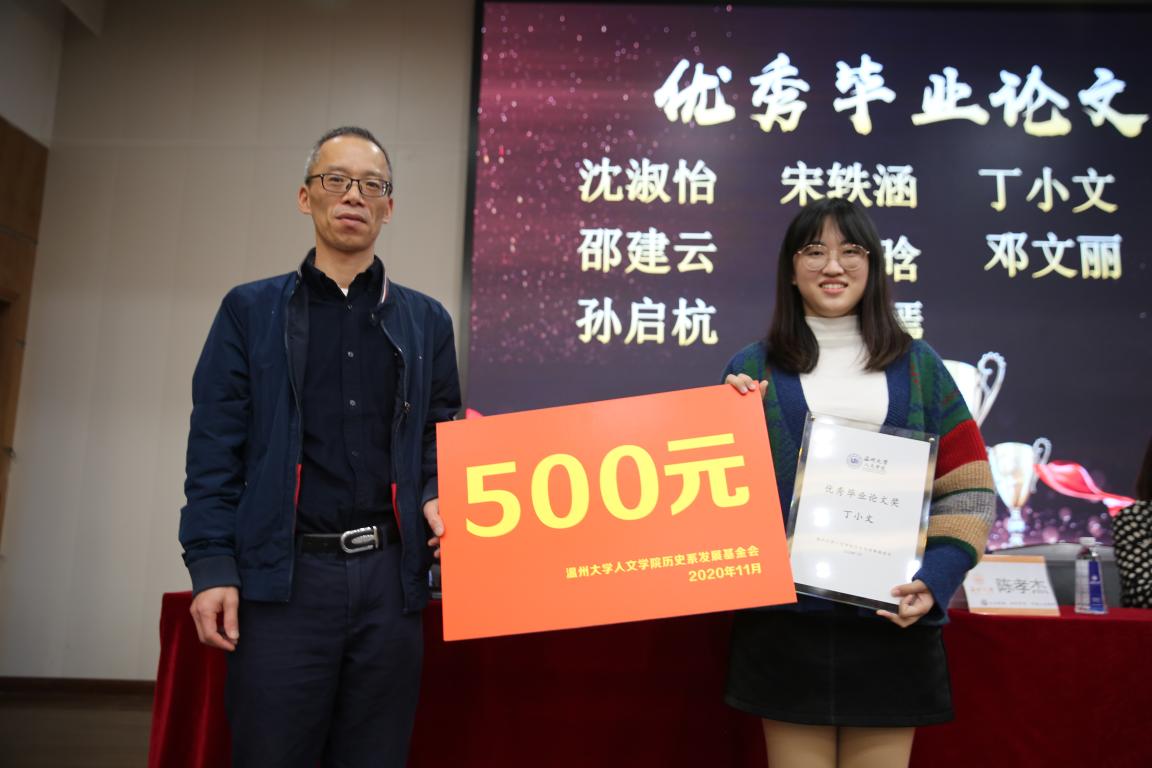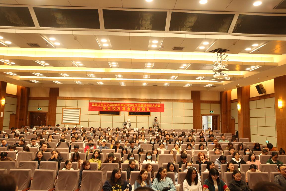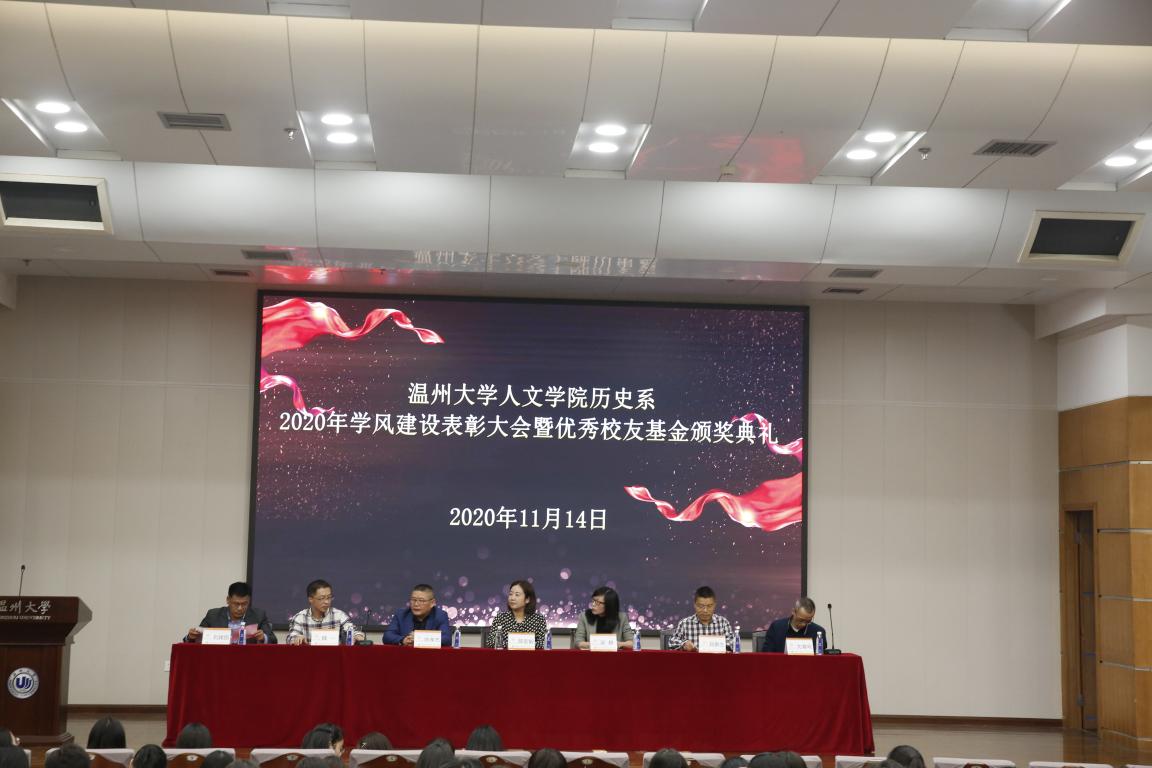 2020年11月14日14时,德赢官网历史系2020年学风建设表彰大会暨优秀校友基金颁奖典礼于北校区信息楼报告厅举行。此次表彰大会暨颁奖典礼由德赢官网历史系发展基金会会长刘建国主持,温州万全教育集团董事长陈孝杰、德赢ac米兰官方合作vwin校友办主任陈宏毅、德赢ac米兰官方合作vwin党委书记吴静、副院长郑春生、副书记魏一、历史系主任尤育号以及历史系全体师生出席了此次会议。